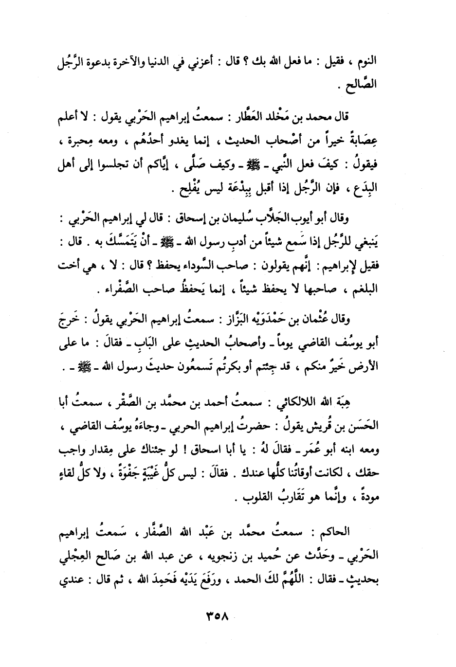 قَالَ مُحَمَّدُ بنُ مَخْلَدٍ العَطَّارُ: سَمِعْتُ إِبْرَاهِيْمَ الحَرْبِيَّ يَقُوْلُ: لاَ أَعِلْم عِصَابَةً خَيْراً مِنْ أَصْحَابِ الحَدِيْثِ، إِنَّمَا يَغْدُو أَحَدُهُم، وَمَعَهُ مِحْبَرَةً، فَيَقُوْلُ: كَيْفَ فَعَلَ النَّبِيُّ -صَلَّى اللَّهُ عَلَيْهِ وَسَلَّمَ- وَكَيْفَ صَلَّى، إِيَّاكُم أَنْ تَجْلِسُوا إِلَى أَهْلِ البِدَعِ، فَإِنَّ الرَّجُلَ إِذَا أَقبَلَ بَبِدْعَةٍ لَيْسَ يُفْلِح.