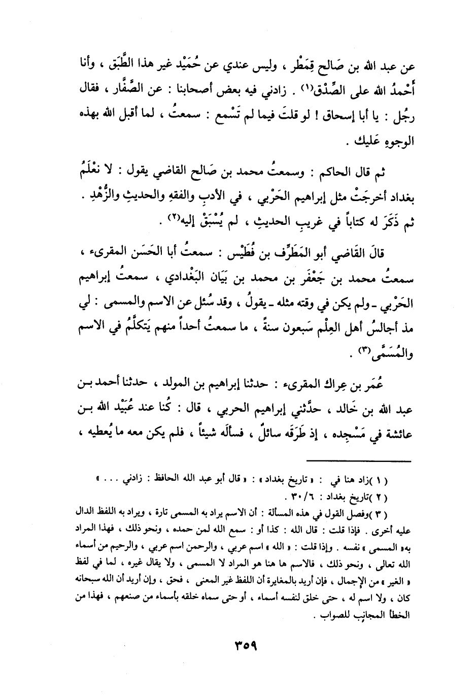 قَالَ القَاضِي أَبُو المُطَرِّفِ بنُ فُطَيْسٍ: سَمِعْتُ أَبَا الحَسَنِ المُقْرِئَ، سَمِعْتُ مُحَمَّدَ بنَ جَعْفَرِ بنِ مُحَمَّدِ بنِ بَيَانٍ البَغْدَادِيَّ، سَمِعْتُ إِبْرَاهِيْمَ الحَرْبِيَّ - وَلَمْ يَكُنْ فِي وَقْتِهِ مِثْلُهُ - يَقُوْلُ، وَقَدْ سُئِلَ عَنِ الاسْمِ وَالمُسَمَّى: