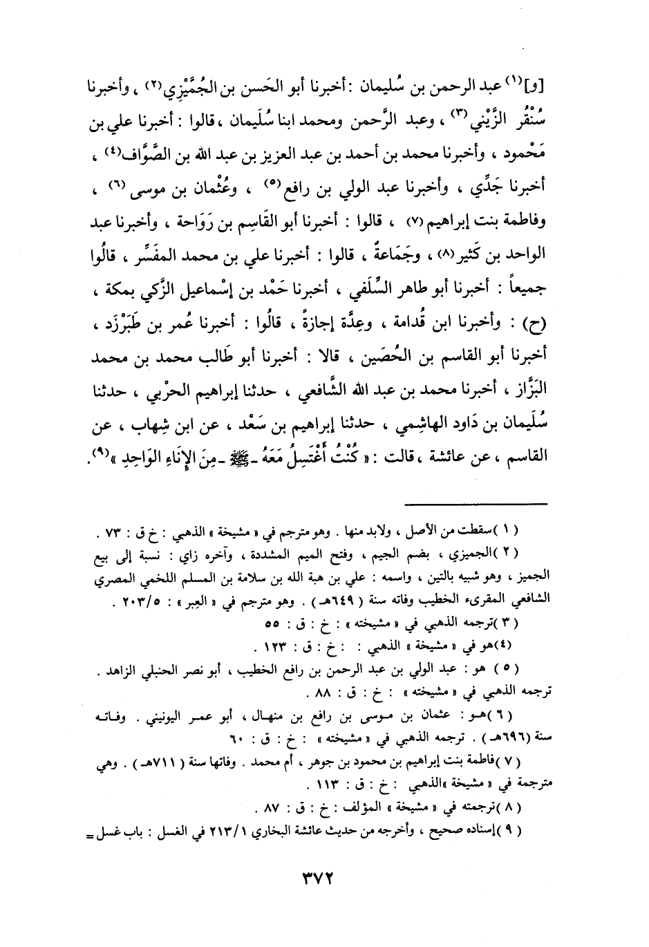 [وَ] (1) عَبْد الرَّحْمَنِ بن سُلَيْمَانَ: أَخْبَرَنَا أَبُو الحَسَنِ بنُ الجُمَّيْزِي (2) ، وَأَخْبَرَنَا سُنْقُرُ الزَّيْنِي (3) ، وَعَبْد الرَّحْمَنِ وَمُحَمَّد؛ ابْنا سُلَيْمَان، قَالُوا: أَخْبَرَنَا عَلِيُّ بنُ مَحْمُوْدٍ، وَأَخْبَرَنَا مُحَمَّدُ بنُ أَحْمَدَ بنِ عَبْدِ العَزِيْزِ بنِ عَبْدِ اللهِ بنِ الصَّوَّاف (4) ، أَخْبَرَنَا جَدِّي، وَأَخْبَرَنَا عَبْدُ الوَلِيّ بن رَافِعٍ (5) ، وَعُثْمَان بن مُوْسَى (6) ، وَفَاطِمَة بِنْت إِبْرَاهِيْم (7) ، قَالُوا: