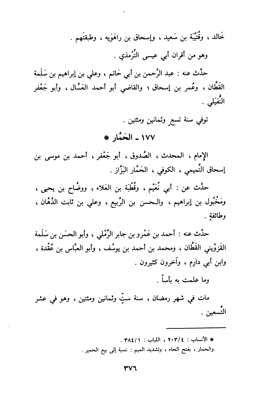 (*) الأنساب: 4 / 203، اللباب: 1 / 384. والحمار، بفتح الحاء، وتشديد الميم: نسبة إلى بيع الحمير.