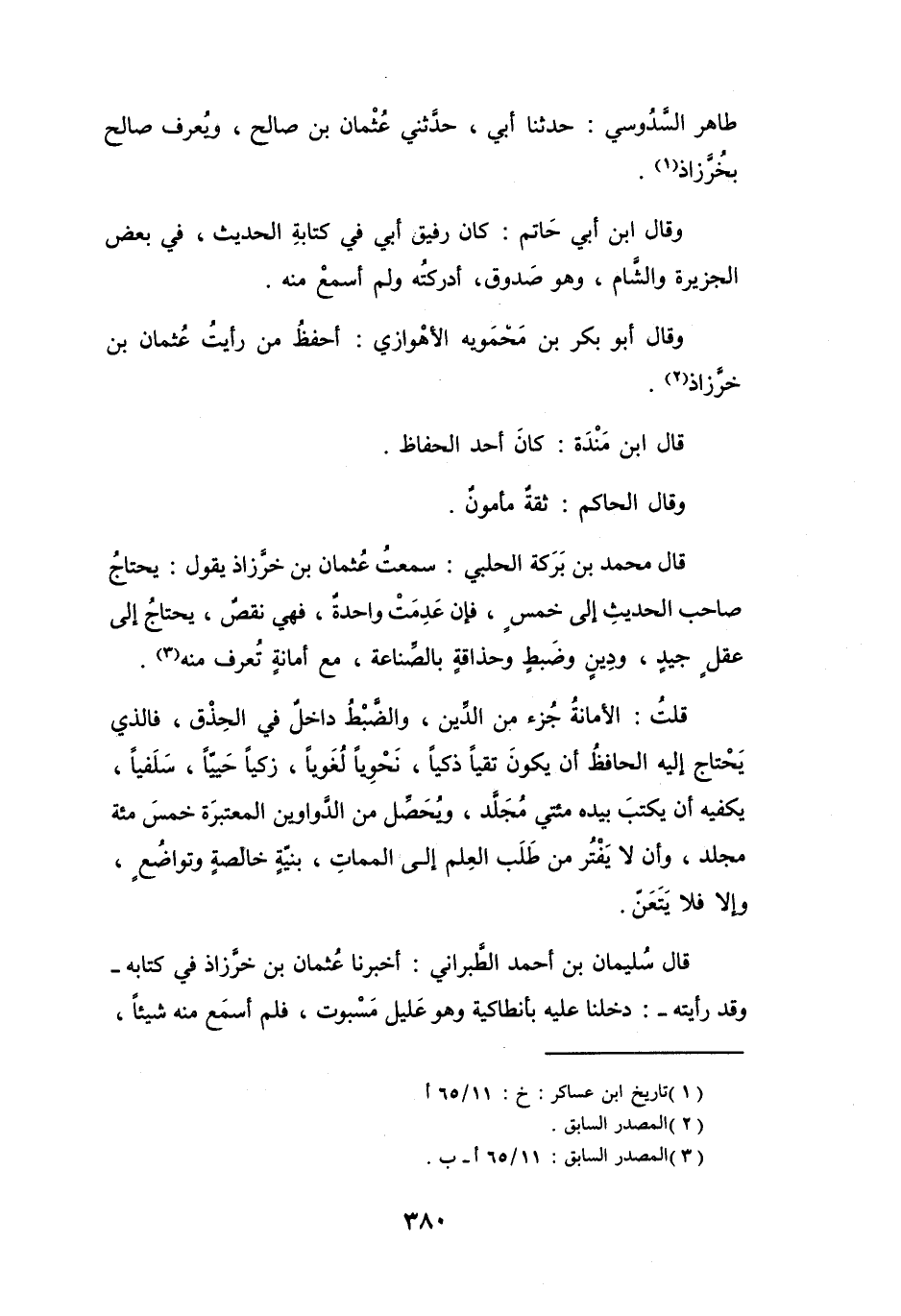 قَالَ مُحَمَّدُ بنُ بَرَكَةَ الحَلَبِيّ: سَمِعْتُ عُثْمَان بن خُرَّزَاذ يَقُوْلُ: يحتَاجُ صَاحِب الحَدِيْثِ إِلَى خَمْسٍ، فَإِن عَدِمَتْ وَاحِدَةٌ، فَهِيَ نقصٌ، يحتَاجُ إِلَى عقلٍ جَيِّدٍ، وَدينٍ وَضَبطٍ وَحذَاقَةٍ بِالصِّنَاعَة، مَعَ أَمَانَةٍ تُعرف مِنْهُ (3) .