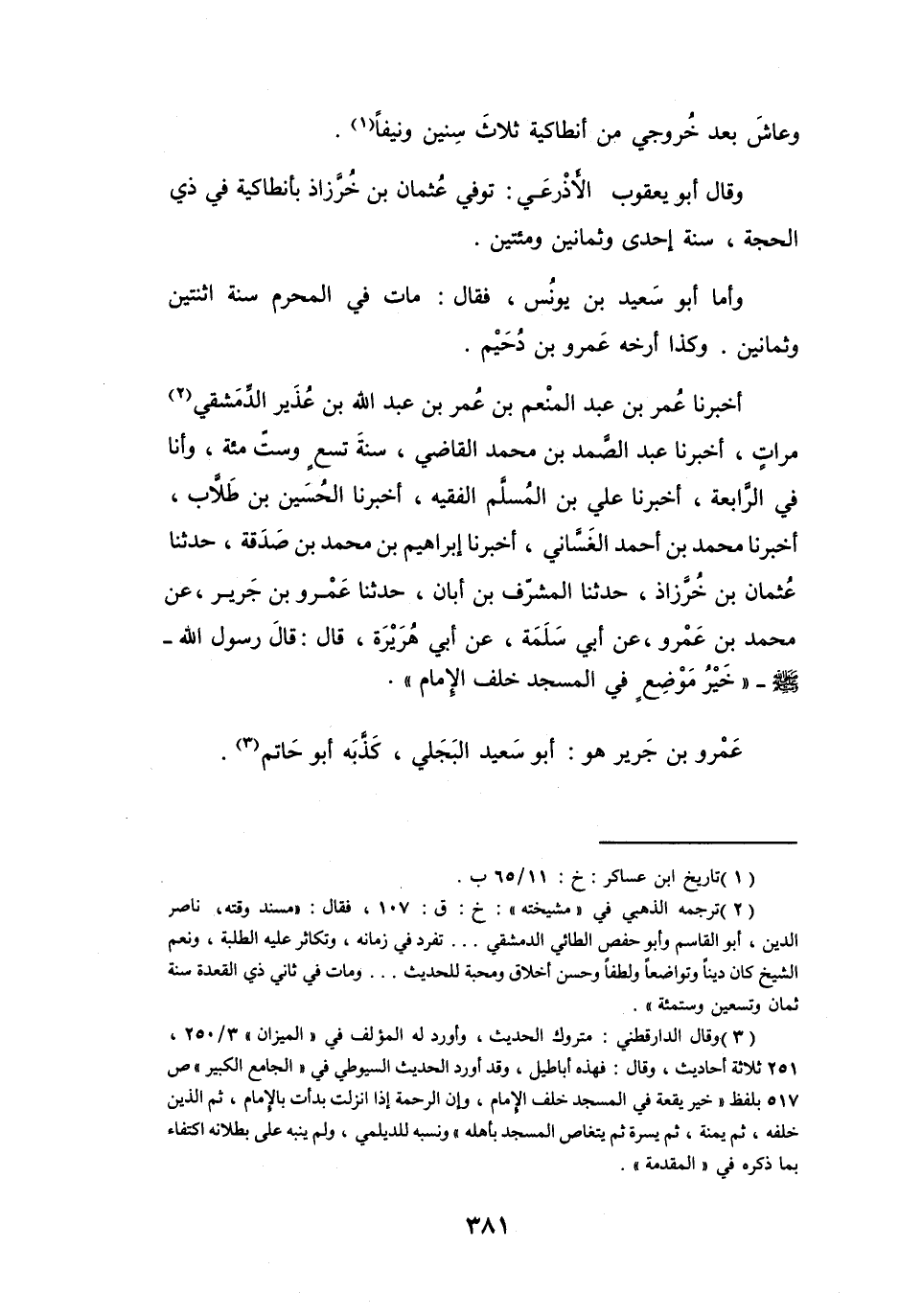 أَخْبَرَنَا عُمَرُ بنُ عَبْدِ المُنْعِمِ بنِ عُمَرَ بنِ عَبْدِ اللهِ بنِ عُذَير الدِّمَشْقِيّ (2) مَرَّات، أَخْبَرَنَا عَبْدُ الصَّمَدِ بنُ مُحَمَّدٍ القَاضِي، سَنَة تِسْعٍ وَسِتِّ مائَة، وَأَنَا فِي الرَّابِعَةِ، أَخْبَرَنَا عَلِيُّ بنُ المُسَلَّمِ الفَقِيْهُ، أَخْبَرَنَا الحُسَيْنُ بنُ طَلاَّب، أَخْبَرَنَا مُحَمَّدُ بنُ أَحْمَدَ الغَسَّانِيّ، أَخْبَرَنَا إِبْرَاهِيْمُ بنُ مُحَمَّدِ بنِ صَدَقَة، حَدَّثَنَا عُثْمَانُ بنُ خُرَّزَاذ، حَدَّثَنَا المشرّف بن أَبَانٍ، حَدَّثَنَا عَمْرُو بنُ جَرِيْرٍ، عَنْ مُحَمَّدِ بنِ عَمْرو، عَنْ أَبِي سَلَمَةَ، عَنْ أَبِي هُرَيْرَةَ، قَالَ: