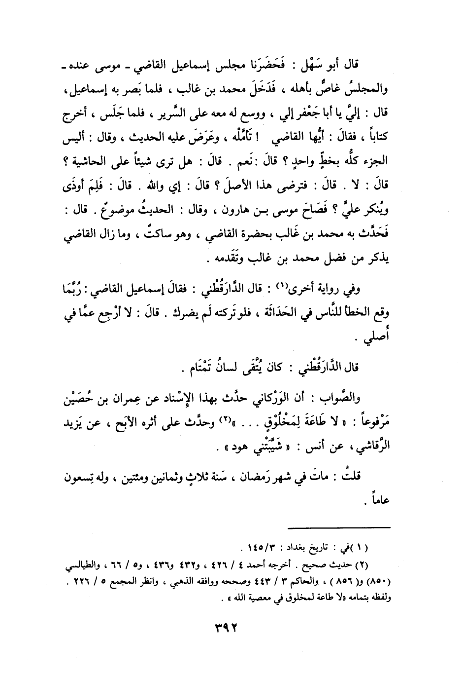 وفِي رِوَايَة أُخْرَى (1) : قَالَ الدَّارَقُطْنِيُّ: فَقَالَ إِسْمَاعِيْلُ القَاضِي: رُبَّمَا وَقَعَ الْخَطَأ لِلنَّاس فِي الحدَاثَة، فَلَو تركته لَمْ يضرّك.