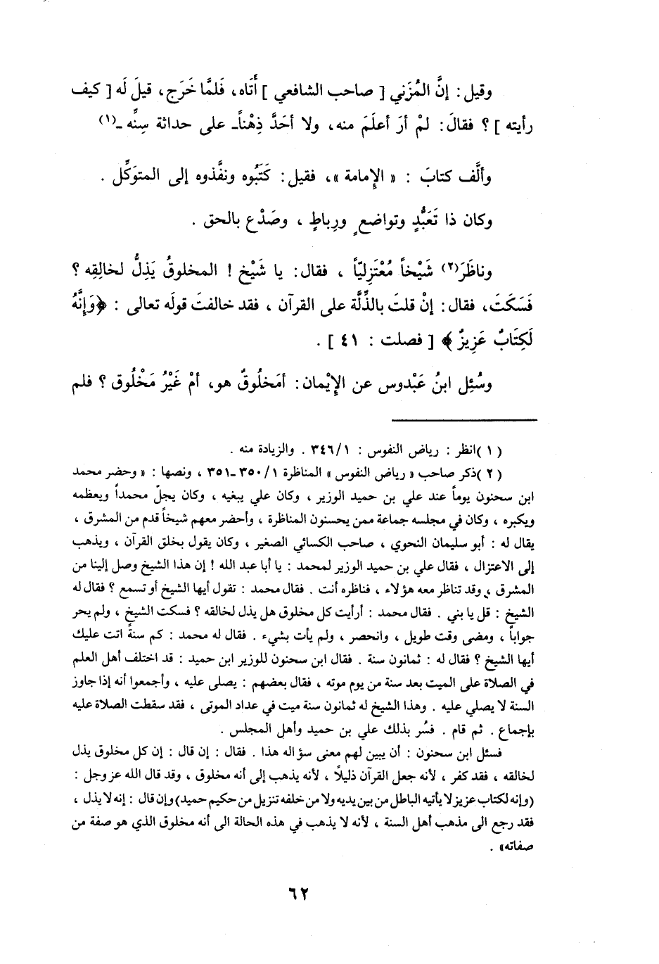 (2) ذكر صاحب " رياض النفوس " المناظرة 1 / 350 - 351، ونصها: " وحضر محمد ابن سحنون يوما عند علي بن حميد الوزير، وكان علي يبغيه، وكان يجل محمدا ويعظمه ويكبره، وكان في مجلسه جماعة ممن يحسنون المناظرة، وأحضر معهم شيخا قدم من المشرق، يقال له: أبو سليمان النحوي، صاحب الكسائي الصغير، وكان يقول بخلق القرآن، ويذهب إلى الاعتزال، فقال علي بن حميد الوزير لمحمد: يا أبا عبد الله! إن هذا الشيخ وصل إلينا من المشرق، وقد تناظر معه هؤلاء، فناظره أنت.