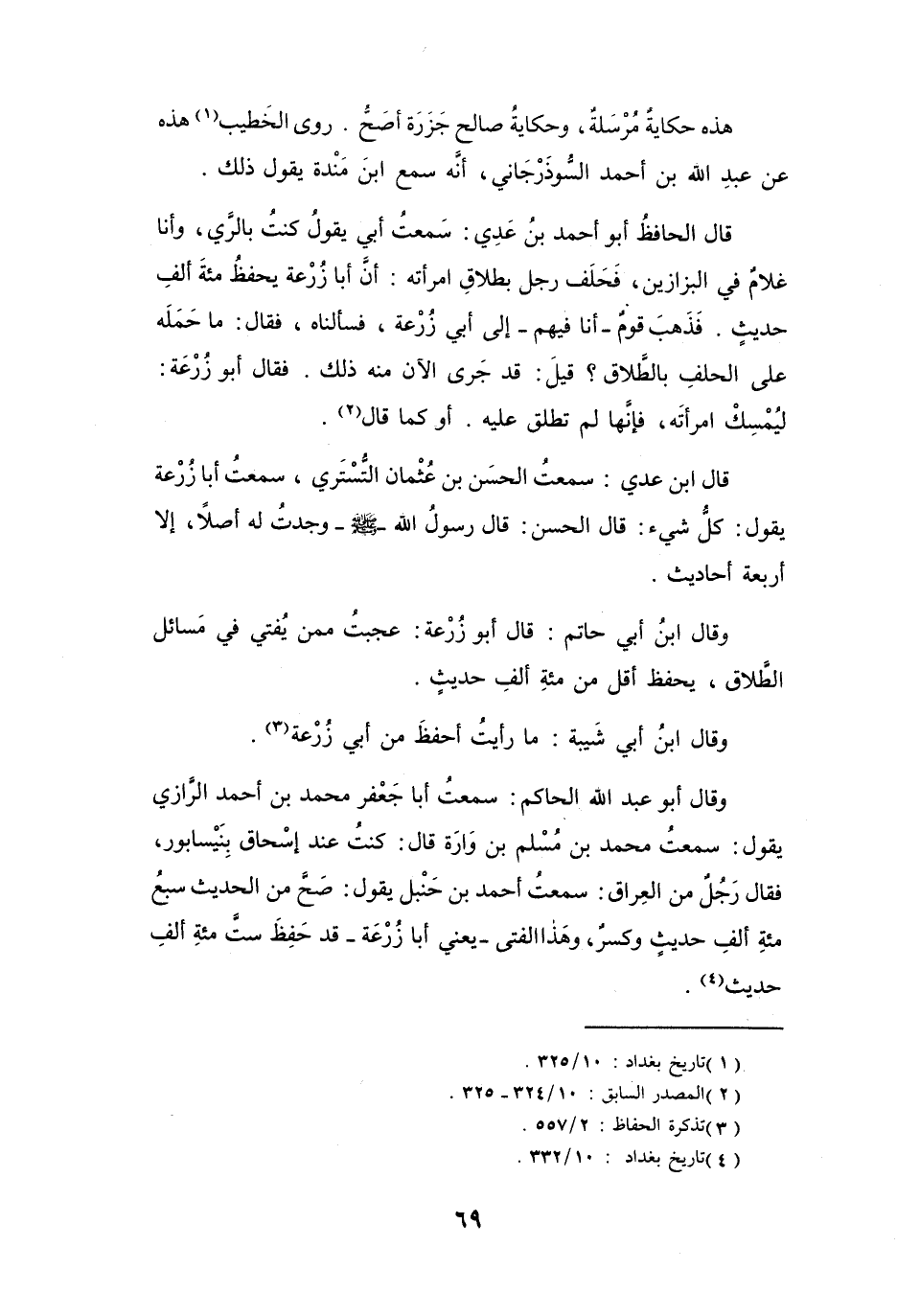 وَقَالَ ابْنُ أَبِي حَاتِمٍ: قَالَ أَبُو زُرْعَةَ: عَجِبْتُ مِمَّنْ يُفْتِي فِي مَسَائِلَ الطَّلاَقِ، يَحْفَظُ أَقَلَّ مِنْ مائَةِ أَلْفِ حَدِيْثٍ.