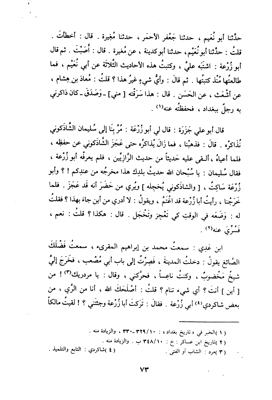 قَالَ: فَذَهَبْنَا، فَمَا زَالَ يُذَاكِرُهُ حَتَّى عَجَزَ الشَّاذَكُوْنِيُّ عَنْ حِفْظِهِ، فَلَمَّا أَعيَاهُ، أَلقَى عَلَيْهِ حَدِيْثاً مِنْ حَدِيْثِ الرَّازِيِّينَ، فَلَم يَعْرِفْهُ أَبُو زُرْعَةَ.