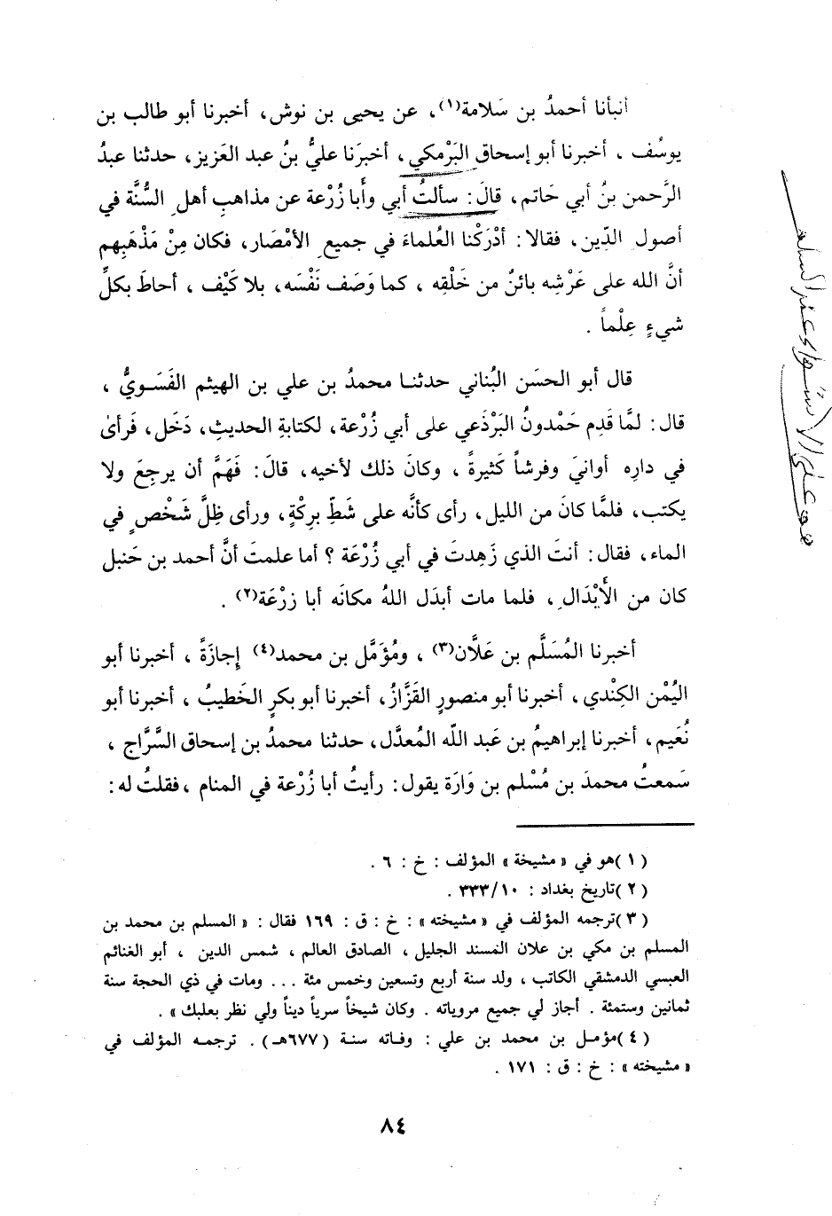 أَخْبَرَنَا المُسَلَّمُ بنُ عَلاَّنَ (3) ، وَمُؤَمَّلُ بنُ مُحَمَّدٍ (4) إِجَازَةً، أَخْبَرَنَا أَبُو اليُمْنِ الكِنْدِيُّ، أَخْبَرَنَا أَبُو مَنْصُوْرٍ القَزَّازُ، أَخْبَرَنَا أَبُو بَكْرٍ الخَطِيْبُ، أَخْبَرَنَا أَبُو نُعَيْمٍ، أَخْبَرَنَا إِبْرَاهِيْمُ بنُ عَبْدِ اللهِ المُعَدَّلُ، حَدَّثَنَا مُحَمَّدُ بنُ إِسْحَاقَ السَّرَّاجُ، سَمِعْتُ مُحَمَّدَ بنَ مُسْلِمِ بنِ وَارَةَ، يَقُوْلُ: