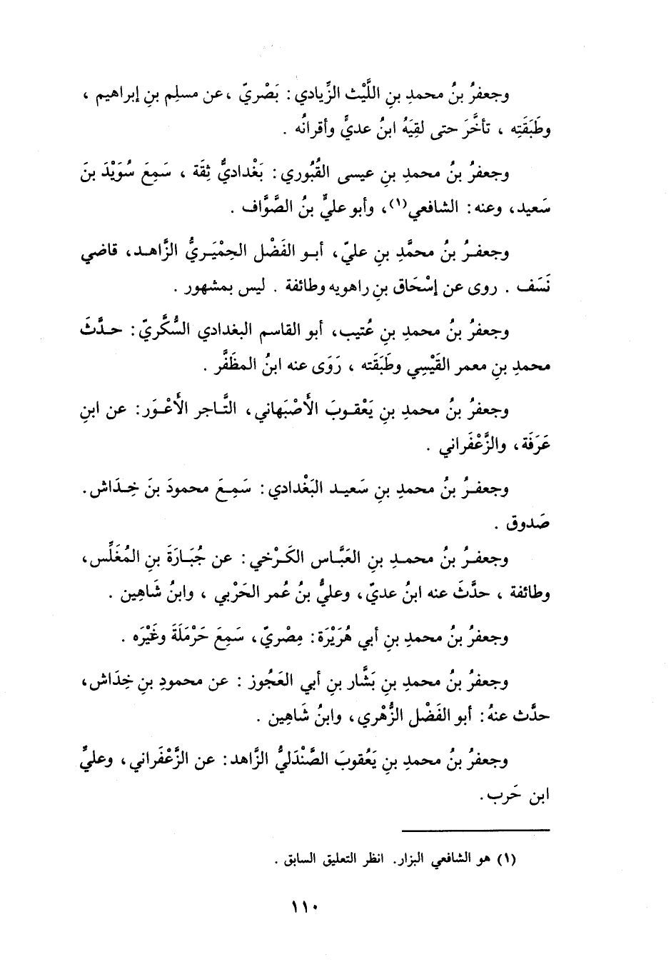 وَجَعْفَرُ بنُ مُحَمَّدِ بنِ سَعِيْدٍ البَغْدَادِيُّ: سَمِعَ مَحْمُوْدَ بنَ خِدَاشٍ، صَدُوْقٌ.
