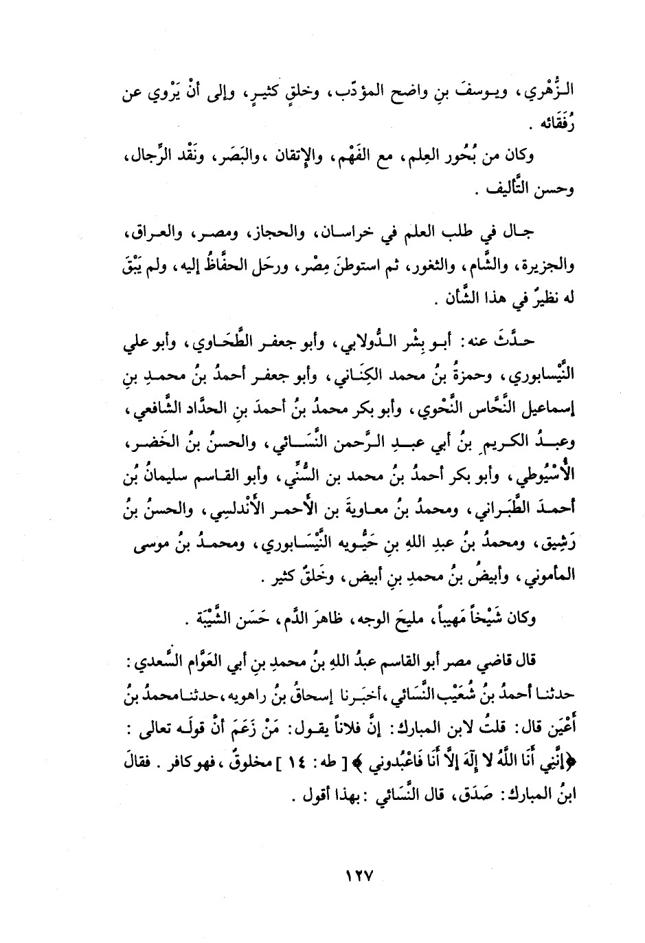 قَالَ قَاضِي مِصْرَ أَبُو القَاسِمِ عَبْدُ اللهِ بنُ مُحَمَّدِ بنِ أَبِي العَوَّامِ السَّعْدِيُّ: حَدَّثَنَا أَحْمَدُ بنُ شُعَيْبٍ النَّسَائِيُّ، أَخْبَرْنَا إِسْحَاقُ بنُ رَاهْوَيْه، حَدَّثَنَا مُحَمَّدُ بنُ أَعْيَنَ قَالَ: قُلْتُ لاِبْنِ المُبَارَكِ: إِنَّ فلاَنَا يَقُوْلُ: مَنْ زَعَمَ أَنَّ قَوْلَهُ تَعَالَى: {إِنَّنِي أَنَا اللهُ لاَ إِلَهَ إِلاَّ أَنَا فَاعْبُدْنِي} [طه:14] مَخْلُوْقٌ فَهُوَ كَافِرٌ.