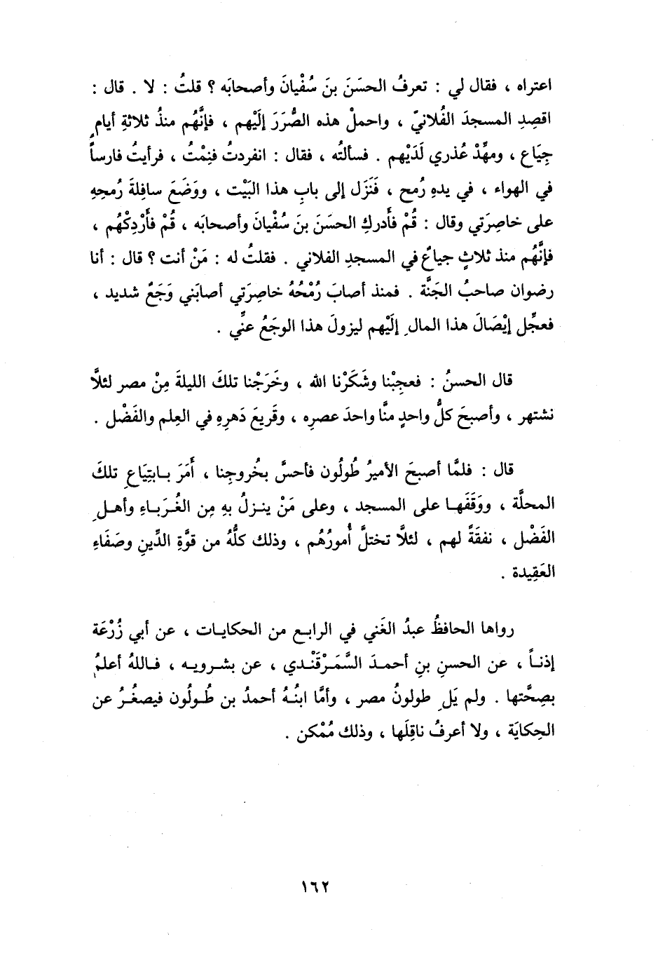 فَسَأَلْتُهُ، فَقَالَ: انفَرَدْتُ فَنِمْتُ، فَرَأَيْتُ فَارِساً فِي الهَوَاءِ، فِي يَدِهِ رُمْحٌ فَنَزَلَ إِلَى بَابِ هَذَا البَيْتِ، وَوَضَعَ سَافِلَةَ رُمْحِهِ عَلَى خَاصِرتِي وَقَالَ: قُمْ فَأَدْرِكِ الحَسَنَ بنَ سُفْيَانَ وَأَصْحَابَهُ، قُمْ فَأَدْرِكْهُمُ، فَإِنَّهُمْ مُنْذُ ثَلاَثٍ جِيَاعٌ فِي المَسْجَدِ الفُلاَنِيّ.