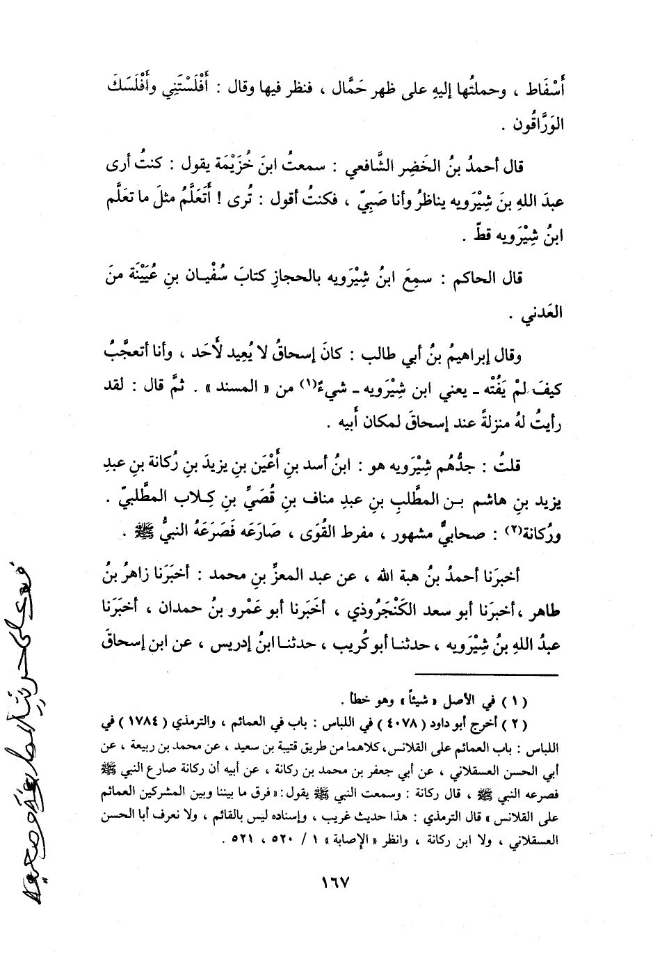 (2) أخرج أبو داود (4078) في اللباس: باب في العمائم، والترمذي (1784) في اللباس: باب العمائم على القلانس، كلاهما من طريق قتيبة بن سعيد، عن محمد بن ربعة، عن أبي الحسن العسقلاني، عن أبي جعفر محمد بن ركانة، عن أبيه أن ركانة صارع النبي صلى الله عليه وسلم فصرعه النبي صلى الله عليه وسلم، قال ركانة: وسمعت النبي صلى الله عليه وسلم يقول: " فرق ما بيننا وبين المشركين العمائم على القلانس " قال الترمذي: هذا حديث غريب، وإسناده ليس بالقائم، ولا نعرف أبا الحسن العسقلاني، ولا ابن ركانة، وانظر " الإصابة " 1 / 520، 521.