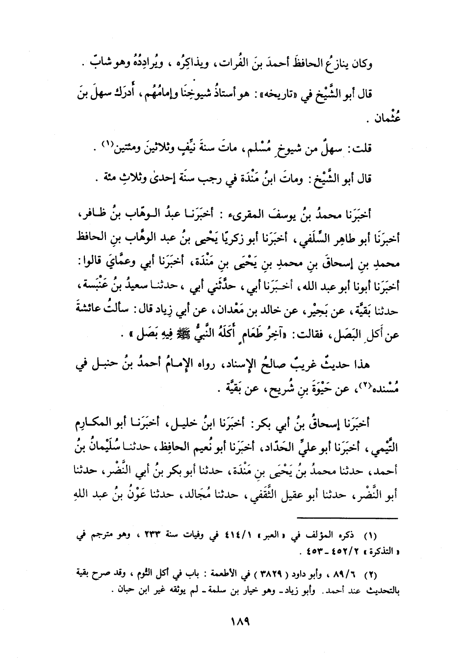 أَخْبَرَنَا مُحَمَّدُ بنُ يُوْسُفَ المُقْرِئ: أَخْبَرَنَا عَبْدُ الوَهَّابِ بنُ ظَافر، أَخْبَرَنَا أَبُو طَاهِرٍ السِّلَفِيُّ، أَخْبَرَنَا أَبُو زَكَرِيَّا يَحْيَى بن عَبْدِ الوَهَّابِ ابْنِ الحَافِظِ مُحَمَّد بنِ إِسْحَاقَ بنِ مُحَمَّدِ بنِ يَحْيَى بنِ مَنْدَة، أَخْبَرَنَا أَبِي وَعَمَّاي قَالُوا: أَخْبَرَنَا أَبونَا أَبُو عَبْدِ اللهِ، أَخْبَرَنَا أَبِي، حَدَّثَنِي أَبِي، حَدَّثَنَا سَعِيْدُ بنُ عَنْبَسَة، حَدَّثَنَا بَقِيَّةُ، عَنْ بَحِيْر، عَنْ خَالِدِ بنِ مَعْدَان، عَنْ أَبِي زِيَادٍ قَالَ: سَأَلْتُ عَائِشَةَ عَنْ أَكل البَصَل، فَقَالَتْ: آخِرُ طَعَامٍ أَكَلَهُ النَّبِيّ - صَلَّى اللَّهُ عَلَيْهِ وَسَلَّمَ - فِيْهِ بَصَل.