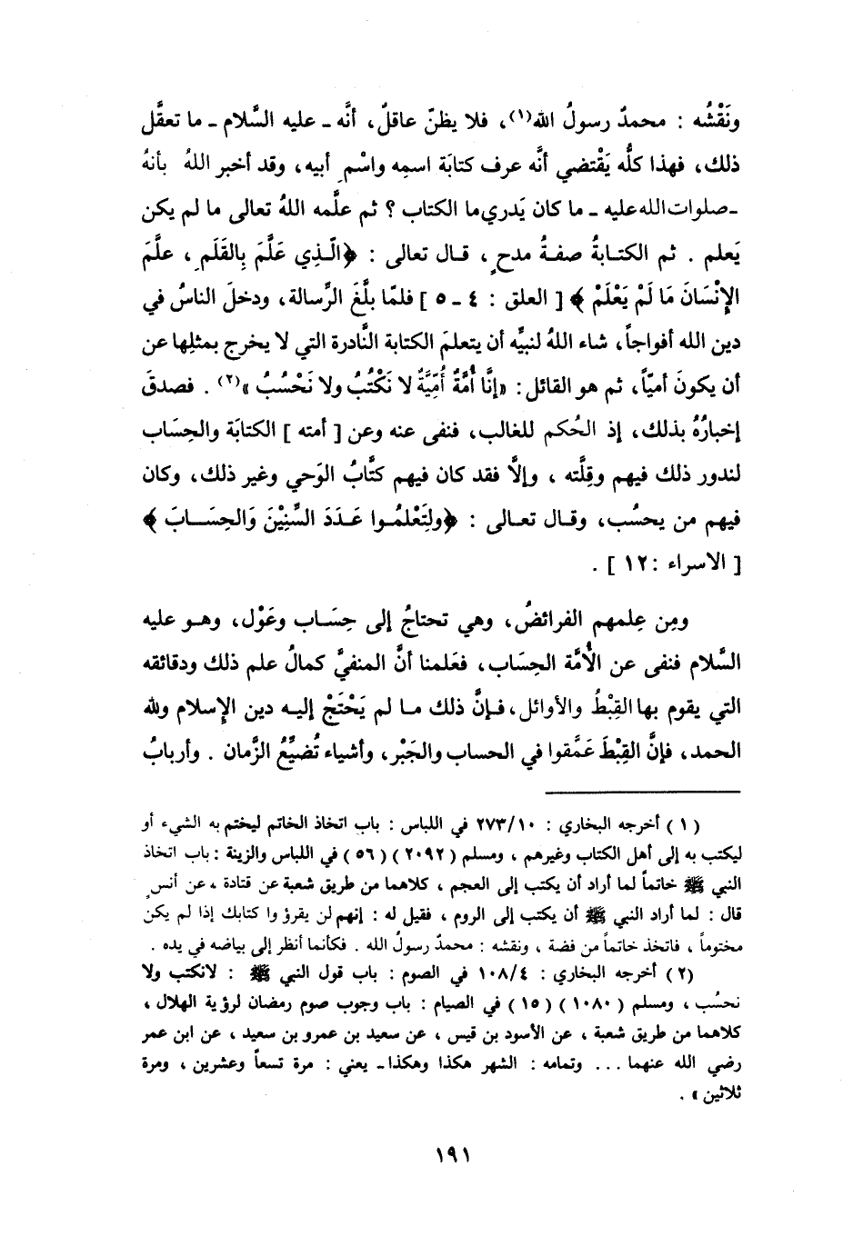 وَمِنْ عِلمهُم الفَرَائِضُ، وَهِيَ تَحتَاجُ إِلَى حِسَاب وَعَوْل، وَهُوَ - عَلَيْهِ السَّلاَمُ - فنفَى عَنِ الأُمَّةِ الحِسَاب، فعَلمنَا أَنَّ المنفيَّ كمَالُ علم ذَلِكَ وَدقَائِقه الَّتِي يَقُوْم بِهَا القِبْطُ وَالأَوَائِل، فَإِنَّ ذَلِكَ مَا لَمْ يَحْتَجْ إِلَيْهِ دين الإِسْلاَم وَلله الْحَمد، فَإِنَّ القِبْطَ عَمَّقُوا فِي الحسَاب وَالجَبْر، وَأَشيَاء تُضيِّعُ الزَّمَان. وَأَربَابُ