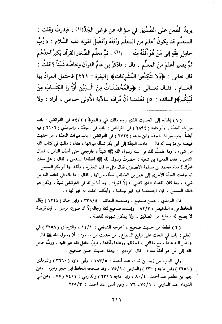 (1) إشارة إلى الحديث الذي رواه مالك في " الموطأ " 2 / 54 في الفرائض: باب ميراث الجدة، وأبو داود (2894) في الفرائض: باب في الجدة، والترمذي (2102) فيه أيضا: باب ميراث الجدة وابن ماجه (2724) في الفرائض: باب ميراث الجدة، من حديث قبيصة بن ذؤيب أنه قال: جاءت الجدة إلى أبي بكر تسأله ميراثها، فقال: مالك في كتاب الله من شيء، وما علمت لك في سنة رسول الله صلى الله عليه وسلم شيئا، فارجعي حتى أسأل الناس، فسأل الناس، فقال المغيرة بن شعبة: حضرت رسول الله صلى الله عليه وسلم أعطاها السدس، فقال: هل معك غيرك؟ فقام محمد بن مسلمة الأنصاري فقال مثل ما قال المغيرة، فأنفذ لها أبو بكر السدس.