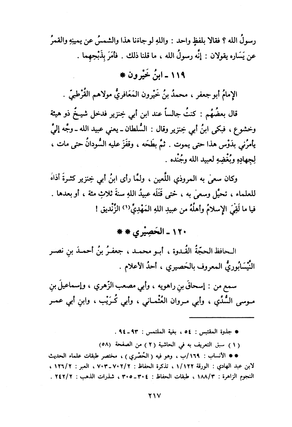 (* *) الأنساب: 169 / ب، وهو فيه (الحصري) ، مختصر طبقات علماء الحديث لابن عبد الهادي: الورقة 122 / 1، تذكرة الحفاظ: 2 / 703 702، العبر: 2 / 126، النجوم الزاهرة: 3 / 188، طبقات الحفاظ: 305 304، شذرات الذهب: 2 / 242.