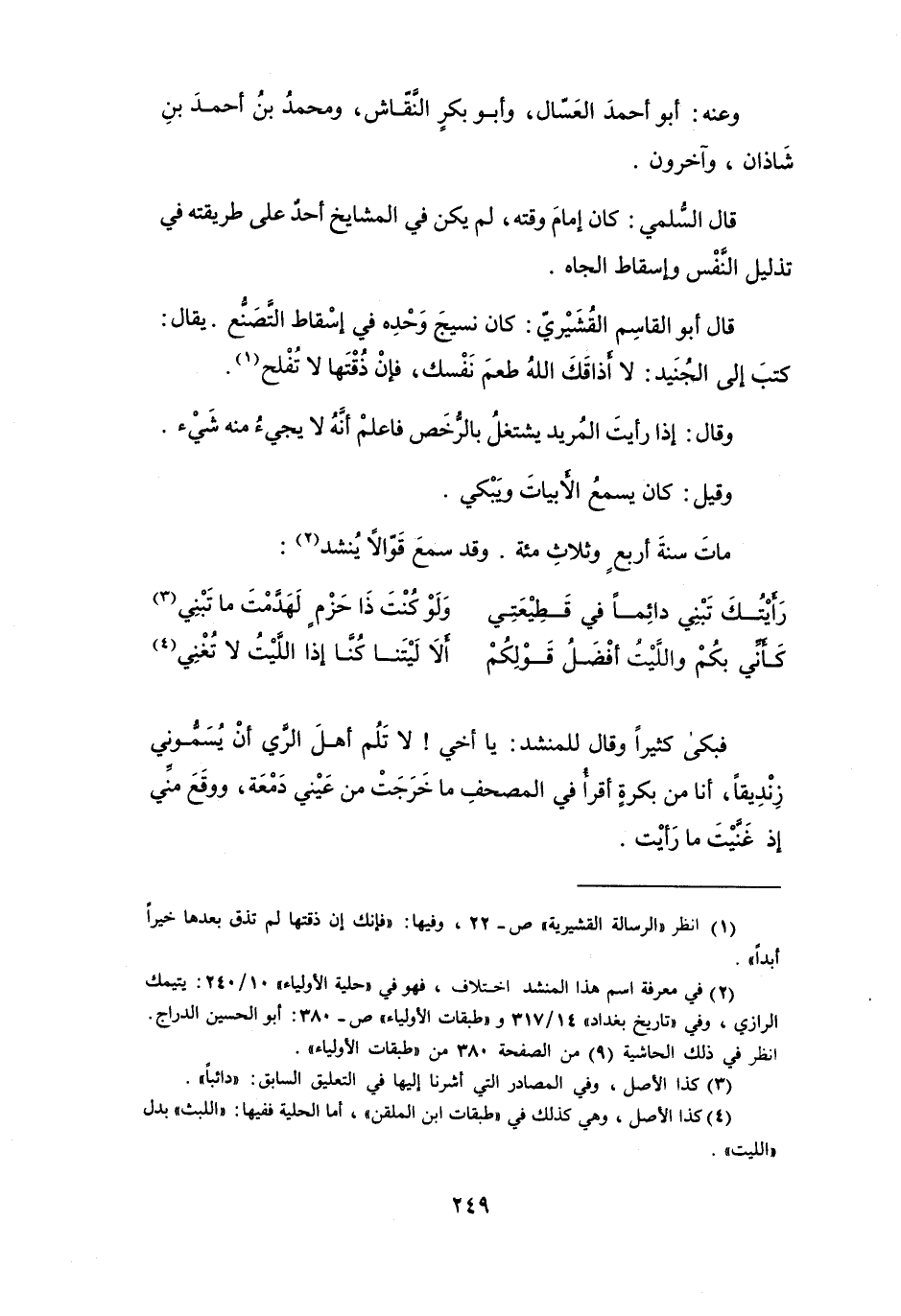 (2) في معرفة اسم هذا المنشد اختلاف، فهو في " حلية الأولياء " 10 / 240: يتيمك الرازي، وفي " تاريخ بغداد " 14 / 317 و" طبقات الأولياء " ص 380: أبو الحسين الدراج.