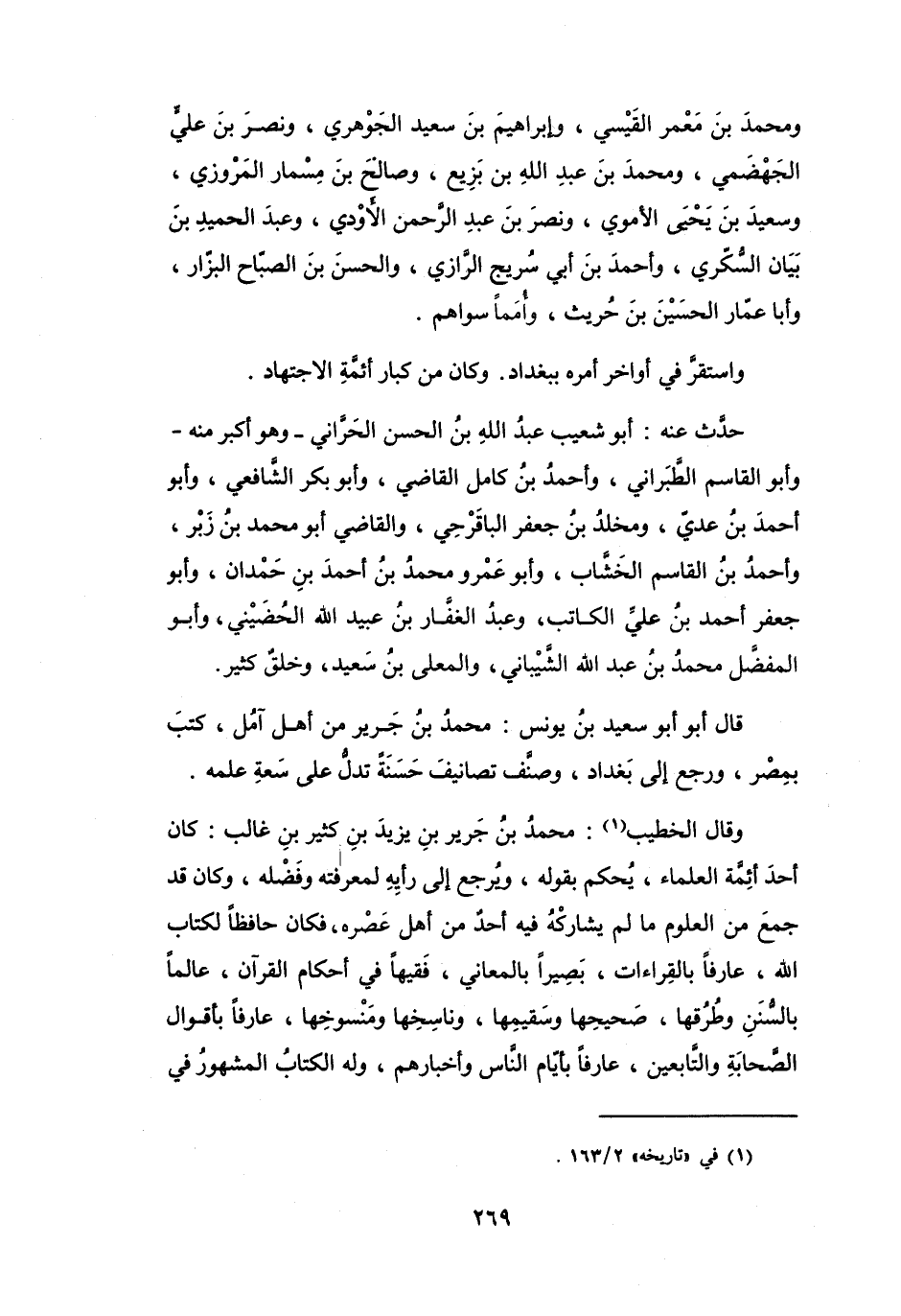 وَقَالَ الخَطِيْبُ (1) :مُحَمَّدُ بنُ جَرِيْرٍ بنِ يَزِيْدَ بنِ كَثِيْرِ بنِ غَالِب: كَانَ أَحَدُ أَئِمَّةِ العُلَمَاء، يُحكم بِقَوله، وَيُرجع إِلَى رأَيهِ لِمَعْرِفَتِهِ وَفَضْله، وَكَانَ قَدْ جَمَعَ مِنَ الْعُلُوم مَا لَمْ يُشَارِكْهُ فِيْهِ أَحَد مِنْ أَهْلِ عَصْره، فَكَانَ حَافِظاً لكتَاب الله، عَارِفاً بِالقِرَاءات، بَصِيْراً بِالمَعَانِي، فَقِيْهاً فِي أَحْكَام القُرْآن، عَالِماً بِالسُّنَنِ وَطُرُقِهَا، صَحيحِهَا وَسَقيمِهَا، وَنَاسِخِهَا وَمَنْسوخِهَا، عَارِفاً بِأَقوَال الصَّحَابَة وَالتَّابِعِيْنَ، عَارِفاً بِأَيَّام النَّاس وَأَخْبَارهم، وَلَهُ الكِتَابُ المَشْهُوْرُ فِي (