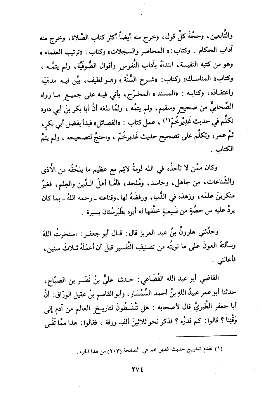 وَكِتَاب (المحَاضِر وَالسجلاَت) ، وَكِتَاب (تَرْتِيْب العُلَمَاء) وَهُوَ مِنْ كتبه النفيسَة، ابتدأَه بآدَاب النُّفُوْسِ وَأَقوَال الصُّوْفِيَّة، وَلَمْ يُتِمَّه، وَكِتَاب (المنَاسك) ، وَكِتَاب (شَرْح السُّنَّة) وَهُوَ لطيف، بَيَّنَ فِيْهِ مذهَبَه وَاعْتِقَادَه، وَكِتَابه (المُسْنَد) المخرَّج، يَأْتِي فِيْهِ عَلَى جَمِيْعِ مَا رَوَاهُ الصَّحَابِيُّ مِنْ صَحِيْحٍ وَسقيمٍ، وَلَمْ يُتِمَّه، وَلَمَّا بلغه أَنَّ أَبَا بَكْرٍ بنَ أَبِي دَاوُدَ تَكَلَّمَ فِي حَدِيْث غَدِيْر خُمّ (1) ، عَمل كِتَاب (الفَضَائِل) فَبدأَ بِفضل أَبِي بَكْرٍ، ثُمَّ عُمَر، وَتكلَّم عَلَى تَصْحِيْحِ حَدِيْث غَدِير خُمّ، وَاحتجَّ لِتَصْحِيْحِهِ، وَلَمْ يتمَّ الكِتَاب.