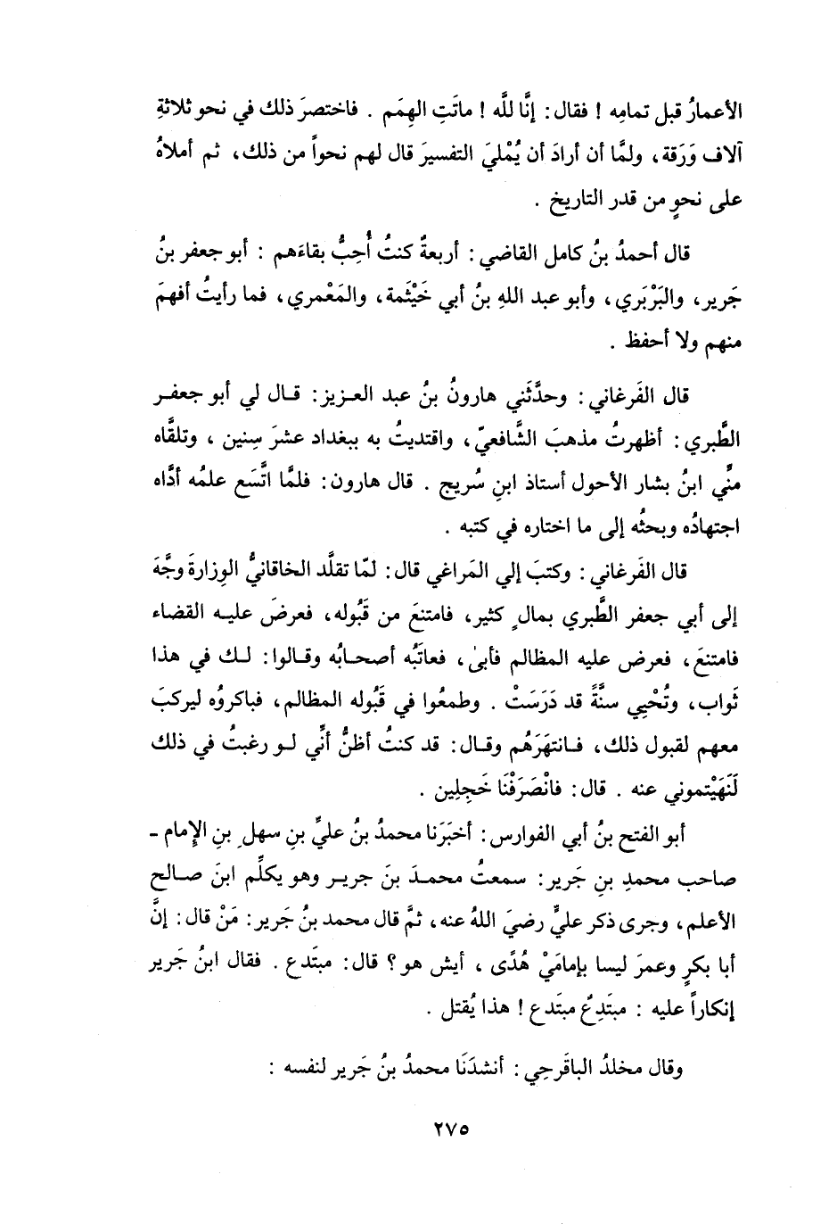قَالَ الفَرغَانِي: وَحَدَّثَنِي هَارُوْنُ بنُ عَبْدِ العَزِيْز: قَالَ لِي أَبُو جَعْفَرٍ الطَّبَرِيّ: أَظهرتُ مَذْهَبَ الشَّافِعِيّ، وَاقتديتُ بِهِ بِبَغْدَادَ عشرَ سِنِيْنَ، وَتلقَّاهُ مِنِّي ابْنُ بَشَّار الأَحْوَل أُسْتَاذ ابْنِ سُرَيْج.