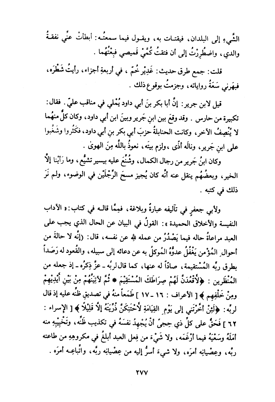 وَكَانَ ابْنُ جَرِيْرٍ مِنْ رِجَال الكَمَال، وَشُنِّعَ عَلَيْهِ بِيَسِيْر تشيُّع، وَمَا رأَينَا إِلاَّ الخَيْر، وَبَعْضُهُم ينْقل عَنْهُ أَنَّهُ كَانَ يُجِيز مسحَ الرِّجْلَيْن فِي الْوضُوء، وَلَمْ نَرَ ذَلِكَ فِي كُتُبِه.
