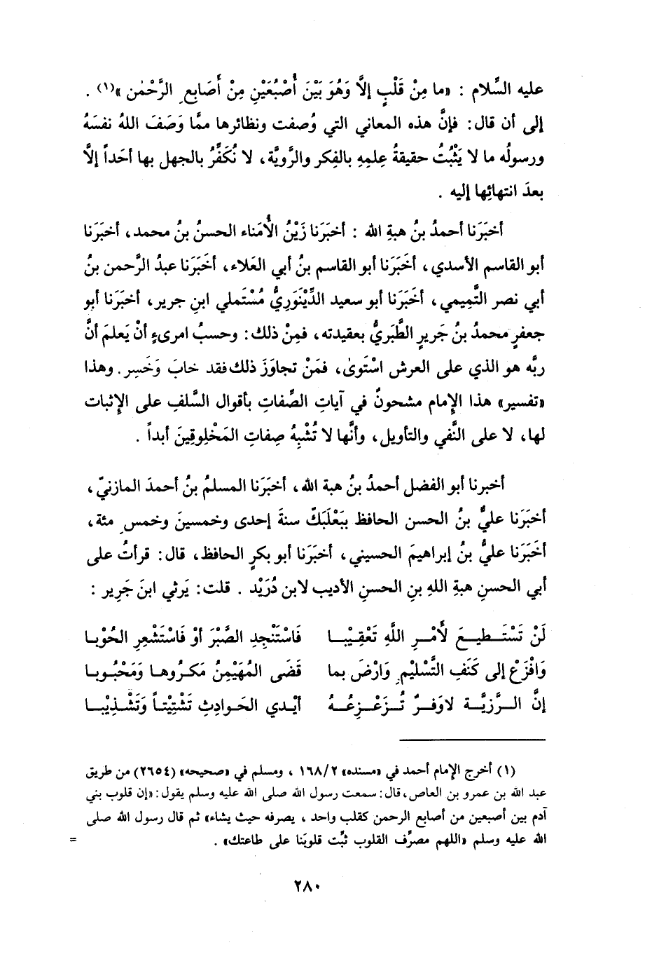 أَخْبَرَنَا أَحْمَدُ بنُ هِبَةِ اللهِ: أَخْبَرَنَا زَيْنُ الأُمنَاء الحَسَنُ بنُ مُحَمَّدٍ، أَخْبَرَنَا أَبُو القَاسِمِ الأَسَدِيّ، أَخْبَرَنَا أَبُو القَاسِمِ بنُ أَبِي العَلاَءِ، أَخْبَرَنَا عَبْدُ الرَّحْمَنِ بنُ أَبِي نَصْرٍ التَّمِيْمِيُّ، أَخْبَرَنَا أَبُو سَعِيْدٍ الدِّيْنَوَرِيُّ مُسْتَمْلِي ابْنِ جَرِيْرٍ، أَخْبَرَنَا أَبُو جَعْفَرٍ مُحَمَّدُ بنُ جَرِيْرٍ الطَّبَرِيُّ بِعَقِيدَتِهِ، فَمِنْ ذَلِكَ: وَحَسْبُ امرِئٍ أَنْ يَعْلَمَ أَنَّ رَبّهُ هُوَ الَّذِي عَلَى الْعَرْش اسْتوَى، فَمَنْ تجَاوَزَ ذَلِكَ فَقَدْ خَابَ وَخَسِرَ.