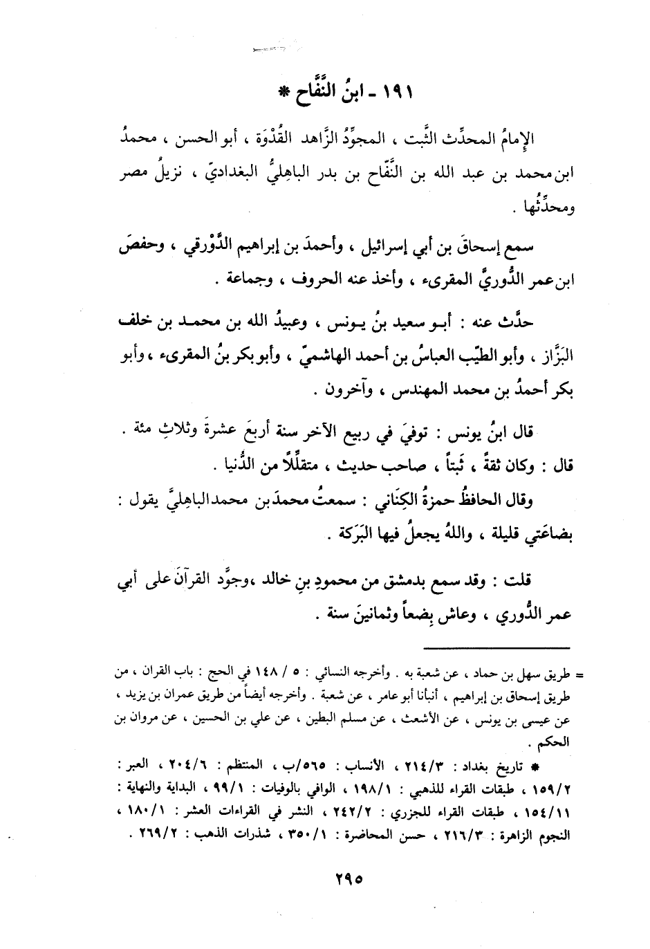 الإِمَامُ، المُحَدِّثُ، الثَّبْتُ، المُجَوِّدُ، الزَّاهِدُ، القُدْوَةُ، أَبُو الحَسَنِ مُحَمَّدُ بنُ مُحَمَّدِ بنِ عَبْدِ اللهِ بنِ النَّفَّاحِ بنِ بَدْرٍ البَاهِلِيُّ البَغْدَادِيُّ، نَزِيْلُ مِصْر وَمُحَدِّثُهَا.