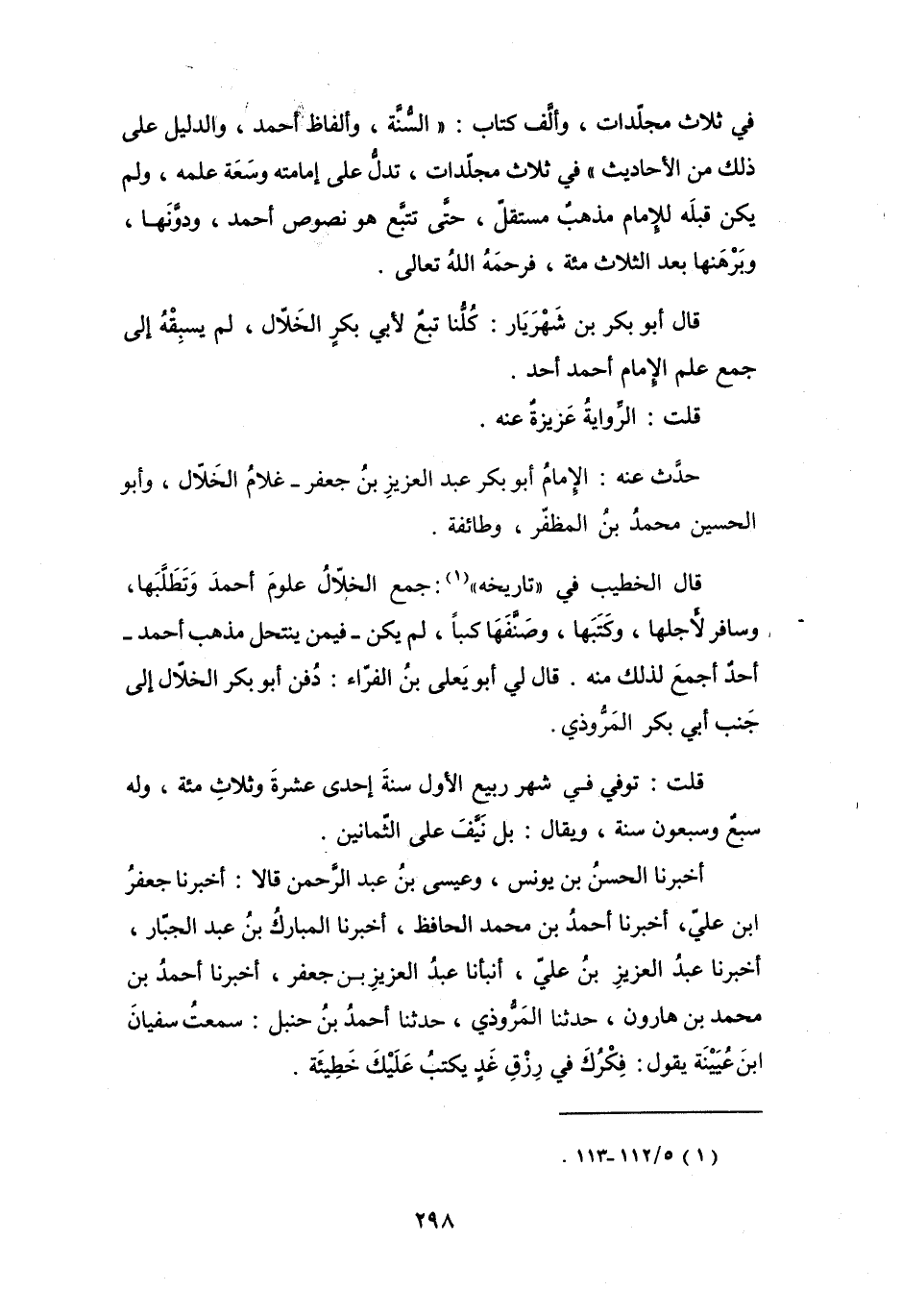فِي ثَلاَث مُجَلَّدَات، وَأَلف كِتَاب (السُّنَّة، وَأَلْفَاظ أَحْمَد، وَالدليل عَلَى ذَلِكَ مِنَ الأَحَادِيْث) فِي ثَلاَث مُجَلَّدَات، تَدُلُّ عَلَى إِمَامته وَسَعَة عِلْمِهِ، وَلَمْ يَكُنْ قبلَه لِلإِمَام مَذْهَبٌ مستقلٌ، حَتَّى تتبَّع هُوَ نُصُوص أَحْمَد، وَدوَّنهَا، وَبَرْهَنَهَا بَعْد الثَّلاَث مائَة، فَرَحِمَهُ اللهُ تَعَالَى.