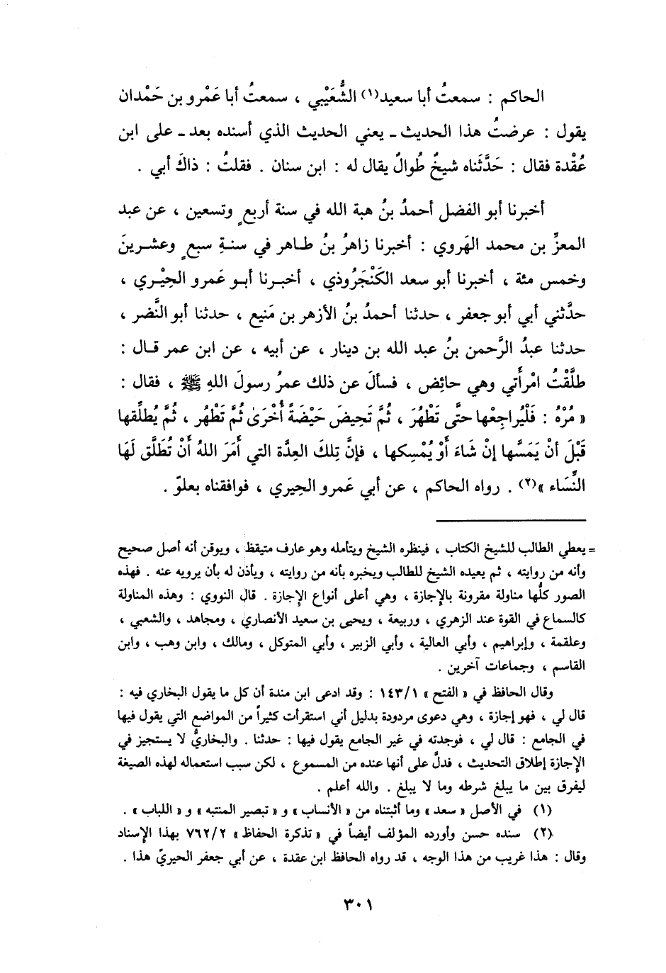 أَخْبَرَنَا أَبُو الفَضْلِ أَحْمَدُ بنُ هِبَةِ اللهِ فِي سَنَةِ أَرْبَعٍ وَتِسْعِيْنَ، عَنْ عَبْدِ المُعِزِّ بنِ مُحَمَّدٍ الهَرَوِيّ: أَخْبَرَنَا زَاهِرُ بنُ طَاهِرٍ فِي سَنَةِ سَبْعٍ وَعِشْرِيْنَ وَخَمْسِ مائَةٍ، أَخْبَرَنَا أَبُو سَعْدٍ الكَنْجَرُوذِيّ، أَخْبَرَنَا أَبُو عَمْرٍو الحِيْرِيّ، حَدَّثَنِي أَبِي أَبُو جَعْفَرٍ، حَدَّثَنَا أَحْمَدُ بنُ الأَزْهَر بن مَنِيْعٍ، حَدَّثَنَا أَبُو النَّضْر، حَدَّثَنَا عَبْدُ الرَّحْمَنِ بنُ عَبْدِ اللهِ بنِ دِيْنَار، عَنْ أَبِيْهِ، عَنِ ابْنِ عُمَرَ قَالَ: طَلَّقْتُ امرأَتِي وَهِيَ حَائِض، فسَأَلَ عَنْ ذَلِكَ عُمَر رَسُوْل اللهِ - صَلَّى اللَّهُ عَلَيْهِ وَسَلَّمَ - فَقَالَ: (مُرْهُ فَلْيُرَاجِعْهَا حَتَّى تَطْهُرَ، ثُمَّ تَحِيْضَ حَيْضَةً أُخْرَى ثُمَّ تَطْهُرَ، ثُمَّ يُطَلِّقهَا قَبْلَ أَنْ يَمَسَّهَا إِنْ شَاءَ أَوْ يُمْسِكهَا، فَإِنَّ تِلْكَ العِدَّة الَّتِي أَمَرَ اللهُ أَنْ تُطَلَّقَ لَهَا النِّسَاء (2)) .