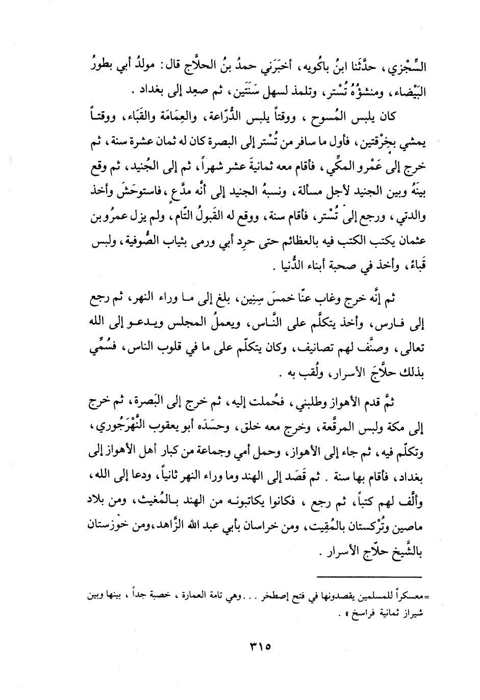 ثمَّ إِنَّهُ خَرَجَ وَغَاب عَنَّا خَمْسَ سِنِيْنَ، بلغَ إِلَى مَا وَرَاء النَّهر، ثُمَّ رَجَعَ إِلَى فَارس، وَأَخَذَ يَتَكَلَّم عَلَى النَّاسِ، وَيعملُ المَجْلِس وَيدعُو إِلَى اللهِ تَعَالَى، وَصَنَّفَ لَهُم تَصَانِيْف، وَكَانَ يَتَكَلَّم عَلَى مَا فِي قُلُوْب النَّاس، فسُمِّيَ بِذَلِكَ حلاَّج الأَسرَار، وَلُقب بِهِ.