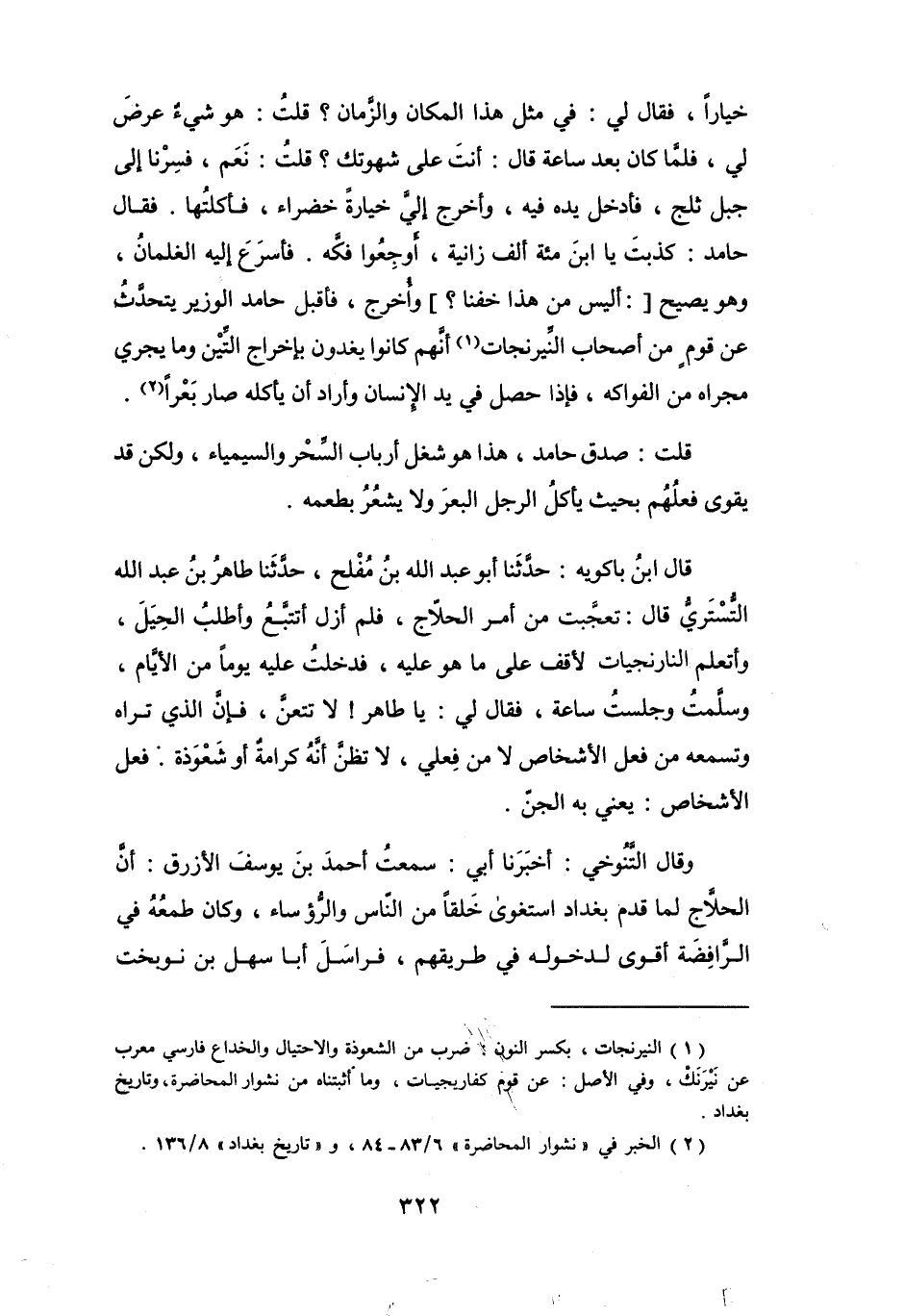 (1) النيرنجات، بكسر النون: ضرب من الشعوذة والاحتيال والخداع فارسي معرب عن نيرنك، وفي الأصل: عن قوم كفاريجيات، وما أثبتناه من نشوار المحاضرة، وتاريخ بغداد.