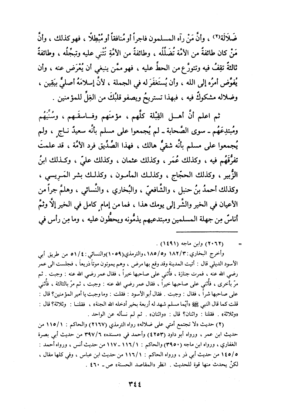 ثمَّ اعْلمْ أَنَّ أَهْلَ القِبْلَةِ كلَّهُم، مُؤْمِنَهُم وَفَاسقَهُم، وَسُنِّيَهُم وَمُبْتَدِعَهُم - سِوَى الصَّحَابَةِ - لَمْ يُجمعُوا عَلَى مُسْلِمٍ بِأَنَّهُ سَعِيْدٌ نَاجٍ، وَلَمْ يُجمعُوا عَلَى مُسْلِمٍ بِأَنَّهُ شقيٌّ هَالكٌ، فَهَذَا الصِّدِّيقُ فردُ الأُمَّةِ، قَدْ علمتَ تَفَرُّقَهُم فِيْهِ، وَكَذَلِكَ عُمَرُ، وَكَذَلِكَ عُثْمَانُ، وَكَذَلِكَ عَلِيٌّ، وَكَذَلِكَ ابْنُ الزُّبَيْرِ، وَكَذَلِكَ الحجَّاجُ، وَكَذَلِكَ المَأْمُوْنُ، وَكَذَلِكَ بشرٌ المَرِيسِيُّ، وَكَذَلِكَ أَحْمَدُ بنُ حَنْبَلٍ، وَالشَّافِعِيُّ، وَالبُخَارِيُّ، وَالنَّسَائِيُّ، وَهَلُمَّ جَرّاً مِنَ الأَعيَانِ فِي الخَيْرِ وَالشَّرِّ إِلَى يَوْمكَ هَذَا، فَمَا مِنْ إِمَامٍ كَامِلٍ فِي الخَيْرِ، إِلاَّ وَثَمَّ أُنَاسٌ مِنْ جهلَةِ المُسْلِمِيْنَ وَمُبْتَدِعِيهِم يذمُّونَه، وَيحطُّونَ عَلَيْهِ، وَمَا مِنْ رَأْسٍ فِي