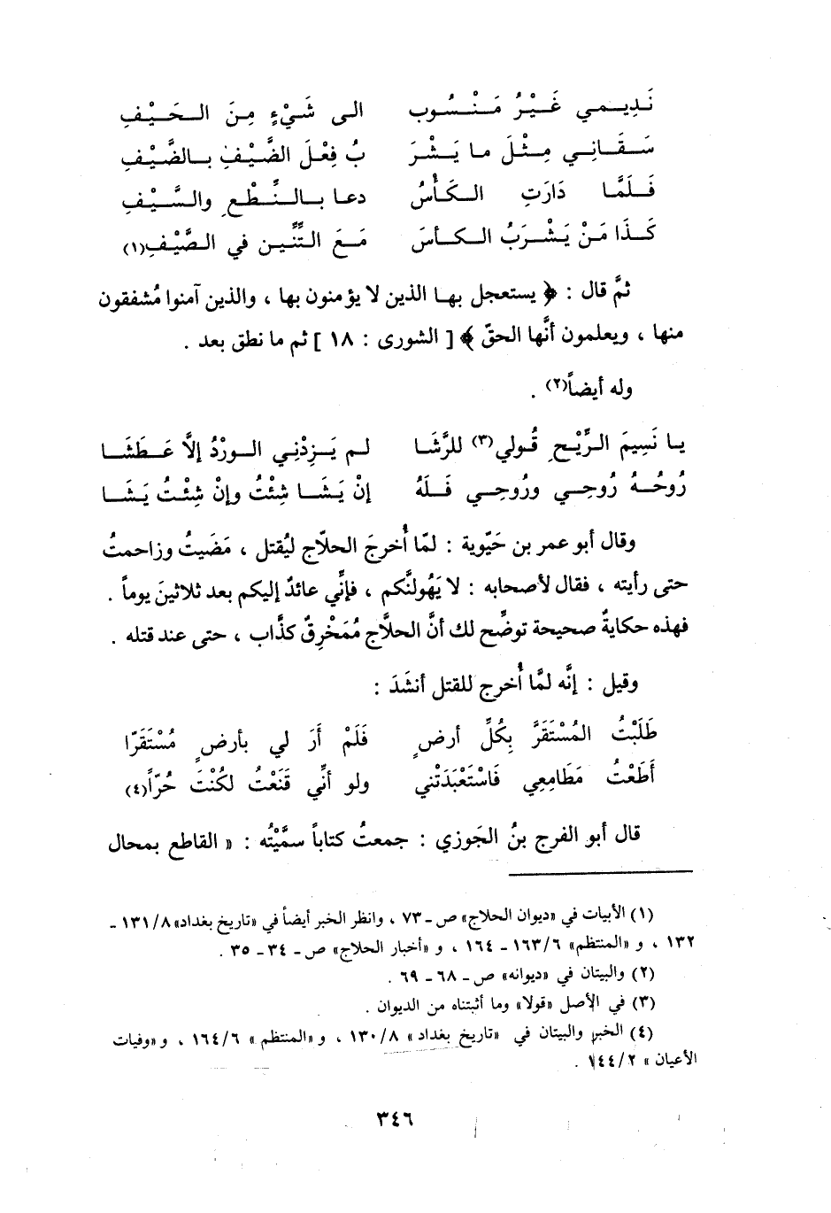 (1) الابيات في " ديوان الحلاج " ص 73، وانظر الخبر أيضا في " تاريخ بغداد " 8 / 131 132، و" المنتظم " 6 / 164 163، و" أخبار الحلاج " ص 35 34.