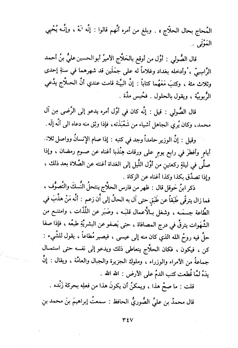 ذَكرَ ابْنُ حَوقلٍ، قَالَ: ظَهرَ مِنْ فَارس الحَلاَّج يَنْتحلُ النُّسكَ وَالتَّصَوُّفَ، فَمَا زَالَ يترقَّى طَبقاً عَنْ طَبَقٍ حَتَّى آلَ بِهِ الحَالُ إِلَى أَنْ زَعَمَ: أَنَّهُ مَنْ هَذَّبَ فِي الطَّاعَةِ جِسمَه، وَشغلَ بِالأَعمَالِ قلبَه، وَصبرَ عَنِ اللَّذَّاتِ، وَامْتَنَعَ مِنَ الشَّهَوَاتِ، يَتَرَقَّ فِي درجِ المصَافَاةِ، حَتَّى يصفُوَ عَنِ البشريَةِ طَبعُه، فَإِذَا صَفَا، حَلَّ فِيْهِ روحُ اللهِ الَّذِي كَانَ مِنْهُ إِلَى عِيْسَى، فَيَصِيْرُ مُطَاعاً، يَقُوْلُ لِلشَّيءِ: كُنْ، فَيَكُوْنُ.