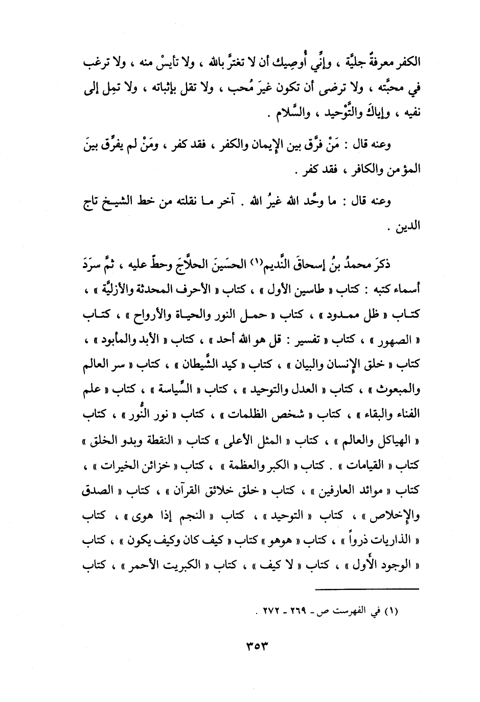 ذَكَرَ مُحَمَّدُ بنُ إِسْحَاقَ النَّدِيمُ (1) الحُسَيْنَ الحَلاَّجَ، وَحَطَّ عَلَيْهِ، ثُمَّ سَرَدَ أَسْمَاءَ كُتُبِه: كِتَابُ (طَاسِين الأَوَّلُ) ، كِتَابُ (الأَحرفِ المُحْدَثَةِ وَالأَزليَّةِ) ، كِتَابُ (ظلٌّ مَمْدُوْدٌ) ، كِتَابُ (حَملُ النُّوْرِ وَالحَيَاةِ وَالأَروَاحِ) ، كِتَابُ (الصُّهورِ) ، كِتَابُ (تَفْسِيْرُ قُلْ هُوَ اللهُ أَحَدٌ) ، كِتَابُ (الأَبدُ وَالمأْبودُ) ، كِتَابُ (خَلقُ الإِنْسَانِ وَالبيَانِ) ، كِتَابُ (كَيدُ الشَّيْطَانِ) ، كِتَابُ (سِرُّ العَالِمِ وَالمَبْعُوثِ) ، كِتَابُ (العَدلُ وَالتَّوحيدُ) ، كِتَابُ (السِّيَاسَةُ) ، كِتَابُ (عِلمُ الفَنَاءِ وَالبَقَاءِ) ، كِتَابُ (شَخص الظُّلمَاتِ) ، كِتَابُ (نُور النُّوْرِ) ، كِتَابُ (الهَيَاكل وَالعَالَم) ، كِتَابُ (المَثَل الأَعْلَى) ، كِتَابُ (النُّقطَة وَبَدوّ الخَلقِ) ، كِتَابُ (القِيَامَات) ، كِتَابُ (الكِبر وَالعَظمَة) ، كِتَابُ (خَزَائِن الخيرَاتِ) ، كِتَابُ (مَوَائِد العَارفينَ) ، كِتَابُ (خَلق خَلاَئِقِ القُرْآنِ) ، كِتَابُ (الصِّدْق وَالإِخْلاَص) ، كِتَابُ (التَّوحيد) ، كِتَابُ (النَّجم إِذَا هَوَى) ، كِتَابُ: (الذَّاريَات ذَرُواً) ، كِتَابُ (هُوَ هُوَ) ، كِتَابُ (كَيْفَ كَانَ وَكَيْفَ يَكُوْنُ) ، كِتَابُ: (الوُجُود الأَوَّلِ) ، كِتَابُ (لاَ كَيْفَ) ، كِتَابُ (الكِبريت الأَحْمَرِ) ، كِتَابُ (