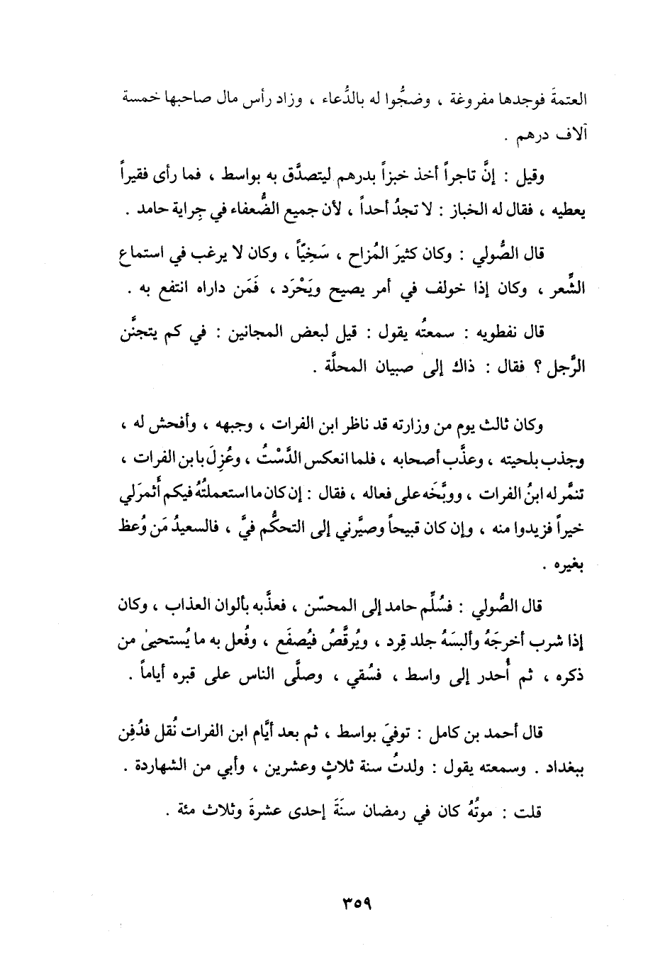 قَالَ الصُّوْلِيُّ: وَكَانَ كَثِيْرَ المُزَاحِ، سَخِيّاً، وَكَانَ لاَ يرغبُ فِي اسْتمَاعِ الشِّعرِ، وَكَانَ إِذَا خُولِفَ فِي أَمرٍ، يَصيحُ، وَيَحْرَدُ، فَمَنْ دَارَاهُ، انْتَفَعَ بِهِ.