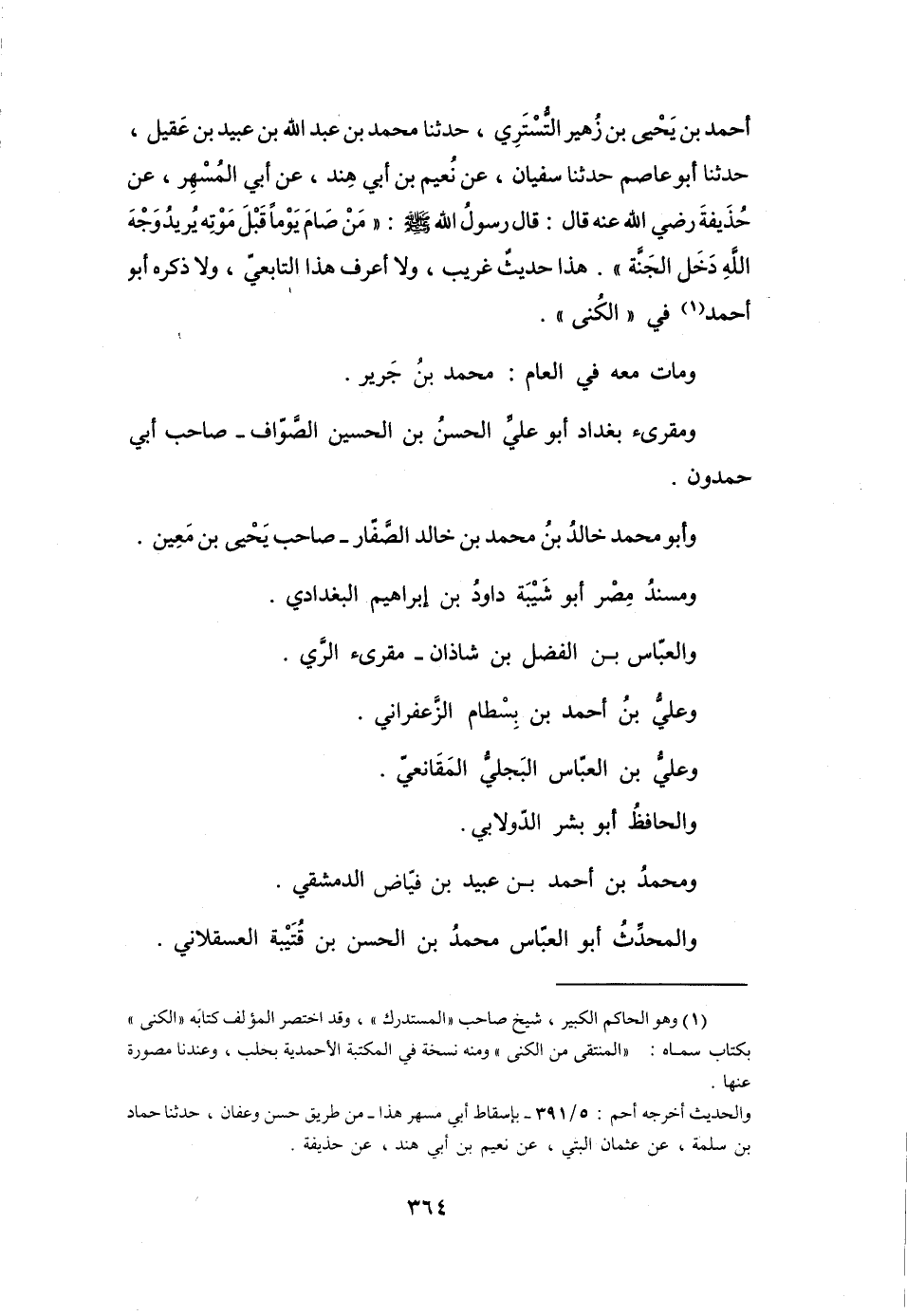 (1) وهو الحاكم الكبير، شيخ صاحب " المستدرك "، وقد اختصر المؤلف كتابه " الكنى " بكتاب سماه: " المنتقى من الكنى " ومنه نسخة في المكتبة الأحمدية بحلب، وعندنا مصورة عنها. والحديث أخرجه أحمد: 5 / 391 بإسقاط أبي مسهر هذا من طريق حسن وعفان، حدثنا حماد بن سلمة، عن عثمان البتي، عن نعيم بن أبي هند، عن حذيفة.
