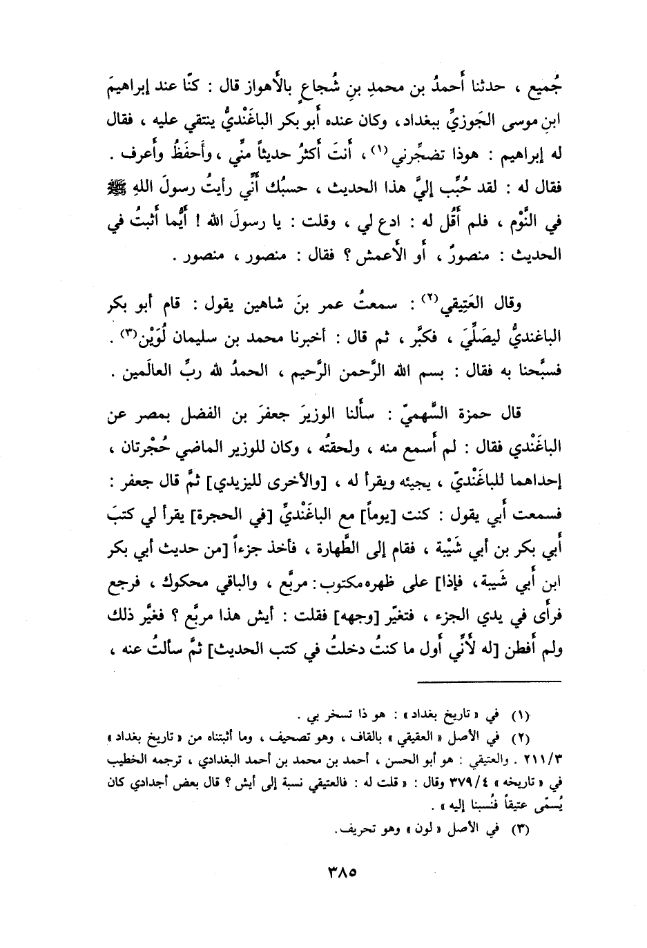 قَامَ أَبُو بَكْرٍ البَاغَنْدِيُّ لِيُصَلِّيَ، فَكَبَّرَ، ثُمَّ قَالَ: أَخْبَرَنَا مُحَمَّدُ بنُ سُلَيْمَانَ لُوَيْنٌ (3) ، فَسَبَّحْنَا بِهِ، فَقَالَ: بِسْمِ اللهِ الرَّحْمَنِ الرَّحِيْمِ، الحَمْدُ للهِ رَبِّ العَالَمِيْنَ.