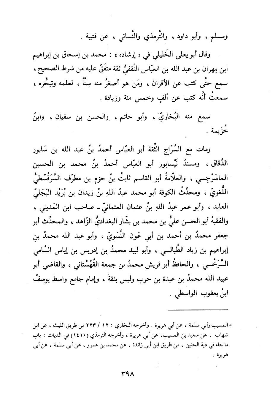 وَمَاتَ مَعَ السَّرَّاجِ: الثِّقَةُ أَبُو العَبَّاسِ أَحْمَدُ بنُ عَبْدِ اللهِ بنِ سَابُوْرَ الدَّقَّاقُ، وَمُسْنِدُ نَيْسَابُوْرَ أَبُو العَبَّاسِ أَحْمَدُ بنُ مُحَمَّدِ بنِ الحُسَيْنِ المَاسَرْجِسِيُّ، وَالعَلاَّمَةُ أَبُو القَاسِمِ ثَابِتُ بنُ حَزْمِ بنِ مُطَرِّفٍ السَّرَقُسْطِيُّ اللُّغَوِيُّ، وَمُحَدِّثُ الكُوْفَةِ أَبُو مُحَمَّدٍ عَبْدُ اللهِ بنُ زَيْدَانَ بنِ بُرَيْدٍ البَجَلِيُّ العَابِدُ، وَأَبُو عُمَرَ عَبْدُ اللهِ بنُ عُثْمَانَ العُثْمَانِيُّ - صَاحِبُ ابْنِ المَدِيْنِيِّ - وَالفَقِيْهُ أَبُو الحَسَنِ عَلِيُّ بنُ مُحَمَّدِ بنِ بَشَّارٍ البَغْدَادِيُّ الزَّاهِدُ، وَالمُحَدِّثُ أَبُو جَعْفَرٍ مُحَمَّدُ بنُ أَحْمَدَ بنِ أَبِي عَوْنٍ النَّسَوِيُّ، وَأَبُو عَبْدِ اللهِ مُحَمَّدُ بنُ إِبْرَاهِيْمَ بنِ زِيَادٍ الطَّيَالِسِيُّ، وَأَبُو لَبِيْدٍ مُحَمَّدُ بنُ إِدْرِيْسَ بنِ إِيَاسٍ السَّامِيُّ السَّرَخْسِيُّ، وَالحَافِظُ أَبُو قُرَيْشٍ مُحَمَّدُ بنُ جُمُعَةَ القُهُسْتَانِيُّ، وَالقَاضِي أَبُو عُبَيْدِ اللهِ مُحَمَّدُ بنُ عَبْدَةَ بنِ حَرْبٍ - وَلَيْسَ بِثِقَةٍ - وَإِمَامُ جَامِعِ وَاسِطَ يُوْسُفُ بنُ يَعْقُوْبَ الوَاسِطِيُّ.