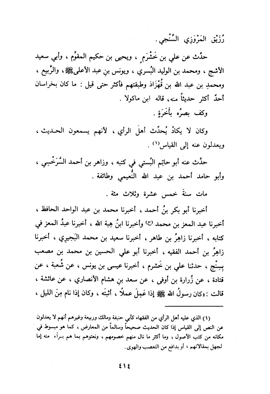 وَكَانَ لاَ يَكَادُ يُحَدِّثُ أَهْلَ الرَّأْيِ؛ لأَنَّهُم يَسْمَعُوْنَ الحَدِيْثَ وَيَعْدِلُوْنَ عَنْهُ إِلَى القِيَاسِ (1) .