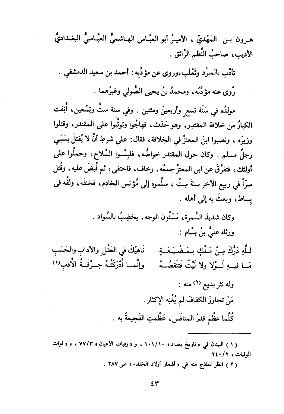 (1) البيتان في " تاريخ بغداد " 10 / 101، و" وفيات الأعيان " 3 / 77، و" فوات الوفيات " 2 / 240.
