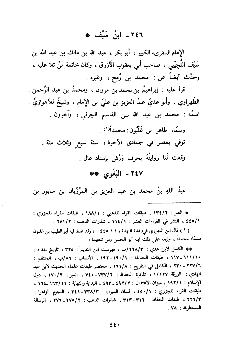 (*) العبر: 2 / 134، طبقات القراء للذهبي: 1 / 188، طبقات القراء للجزري: 1 / 445، النشر في القراءات العشر: 1 / 114، شذرات الذهب: 2 / 251.