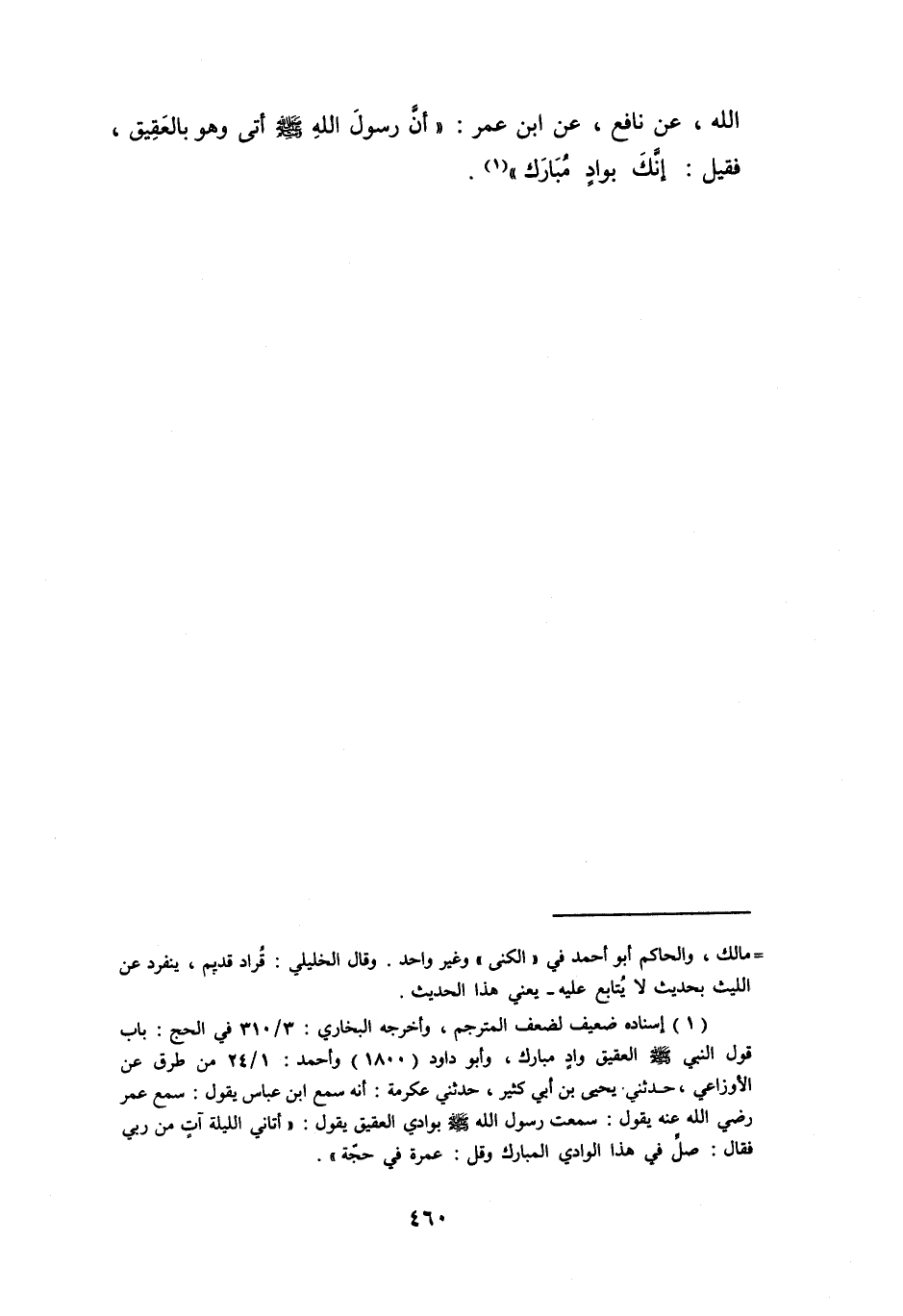 (1) إسناده ضعيف لضعف المترجم، وأخرجه البخاري: 3 / 310 في الحج: باب قول النبي صلى الله عليه وسلم العيق واد مبارك، وأبو داود (1800) وأحمد: 1 / 24 من طرق عن الاوزاعي، حدثني يحيى بن أبي كثير، حدثني عكرمة: أنه سمع ابن عباس يقول: سمع عمر رضي الله عنه يقول: سمعت رسول الله صلى الله عليه وسلم بوادي العقيق يقول: " أتاني الليلة آت من ربي فقال: صل في هذا الوادي المبارك وقل: عمرة في حجة ".