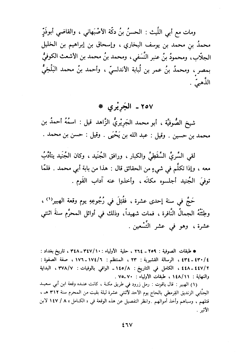 (*) طبقات الصوفية: 264 259، حلية الأولياء: 10 / 348 347، تاريخ بغداد: 4 / 434 430، الرسالة القشيرية: 23، المنتظم: 6 / 176 174، صفة الصفوة: 2 / 448 447، الكامل في التاريخ: 8 / 145 الوافي بالوفيات: 7 / 378، البداية والنهاية: 11 / 148، طبقات الأولياء: 75 70.