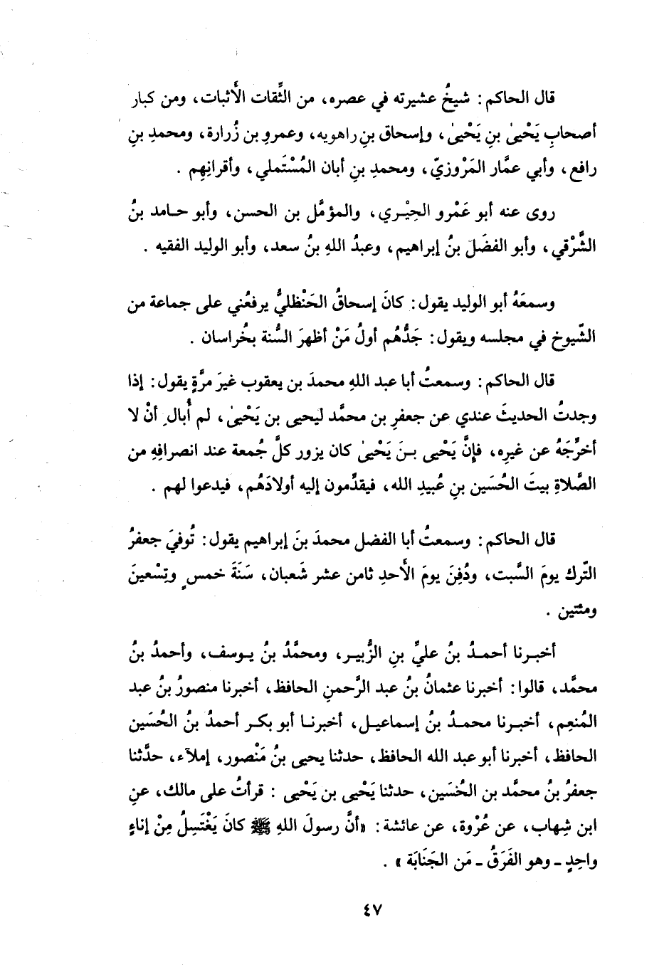 أَخْبَرَنَا عُثْمَانُ بنُ عَبْدِ الرَّحْمَنِ الحَافِظُ، أَخْبَرَنَا مَنْصُوْرُ بنُ عَبْدِ المُنْعِمِ، أَخْبَرَنَا مُحَمَّدُ بنُ إِسْمَاعِيْلَ، أَخْبَرَنَا أَبُو بَكْرٍ أَحْمَدُ بنُ الحُسَيْنِ الحَافِظُ، أَخْبَرَنَا أَبُو عَبْدِ اللهِ الحَافِظُ، حَدَّثَنَا يَحْيَى بنُ مَنْصُوْرٍ إِمْلاَءً، حَدَّثَنَا جَعْفَرُ بنُ مُحَمَّدِ بنِ الحُسَيْنِ، حَدَّثَنَا يَحْيَى بنُ يَحْيَى: