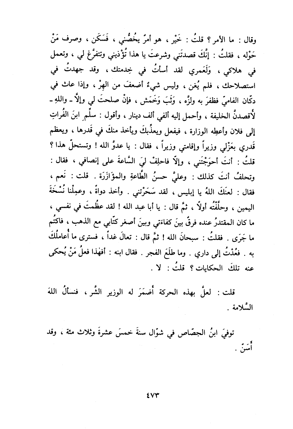 فَسَكَنَ، وَصَرَفَ مَنْ حَوْلَهُ، فَقُلْتُ: إِنَّك قَصَدتَنِي، وَشَرَعتَ يَا هَذَا تُؤْذِينِي، وَتَتَفَرَّغُ لِي، وَتَعْمَلُ فِي هَلاَكِي، وَلَعَمرِي لَقَدْ أَسَأْتُ فِي خِدْمَتِكَ، وَلَقَدْ جَهِدتُ فِي اسْتِصْلاَحِكَ، فَلَمْ يُغْنِ، وَلَيْسَ شَيْءٌ أَضعَفَ مِنَ الهِرِّ، وَإِذَا عَاثَ فِي دُكَانَ الفَامِي، فَظَفِرَ بِهِ، وَلَزَّهُ، وَثَبَ وَخَمَشَ، فَإِنْ صَلُحتَ لِي وَإِلاَّ - وَاللهِ - لأَقصُدَنَّ الخَلِيْفَةَ، وَأَحْمِلَ إِلَيْهِ أَلفَيْ أَلفِ دِيْنَارٍ، وَأَقُولَ: سَلِّمِ ابْنَ الفُرَاتِ إِلَى فُلاَنٍ وَأَعطِهِ الوِزَارَةَ، فَيَفْعَلَ، وَيُعَذِّبَكَ، وَيَأْخُذَ مِنْكَ فِي قَدْرِهَا، وَيُعظِمَ قَدرِي بِعَزْلِي وَزِيْراً وَإِقَامَتِي وَزِيْراً.