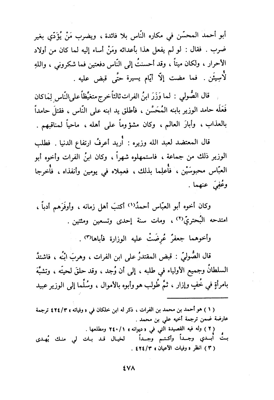 قَالَ الصُّوْلِيُّ: لَمَّا وَزَرَ ابْنُ الفُرَاتِ ثَالِثاً، خَرَجَ مُتَغَيِّظاً عَلَى النَّاسِ لِمَا كَانَ فَعَلَه حَامِدٌ الوَزِيْرُ بِابْنِهِ المُحَسَّنِ، فَأَطلَقَ يَدَ ابْنِه عَلَى النَّاسِ، فَقَتَلَ حَامِداً بِالعَذَابِ، وَأَبارَ العَالَمَ، وَكَانَ مَشْؤُوْماً عَلَى أَهْلِهِ، مَاحِياً لِمَنَاقِبِهِم.