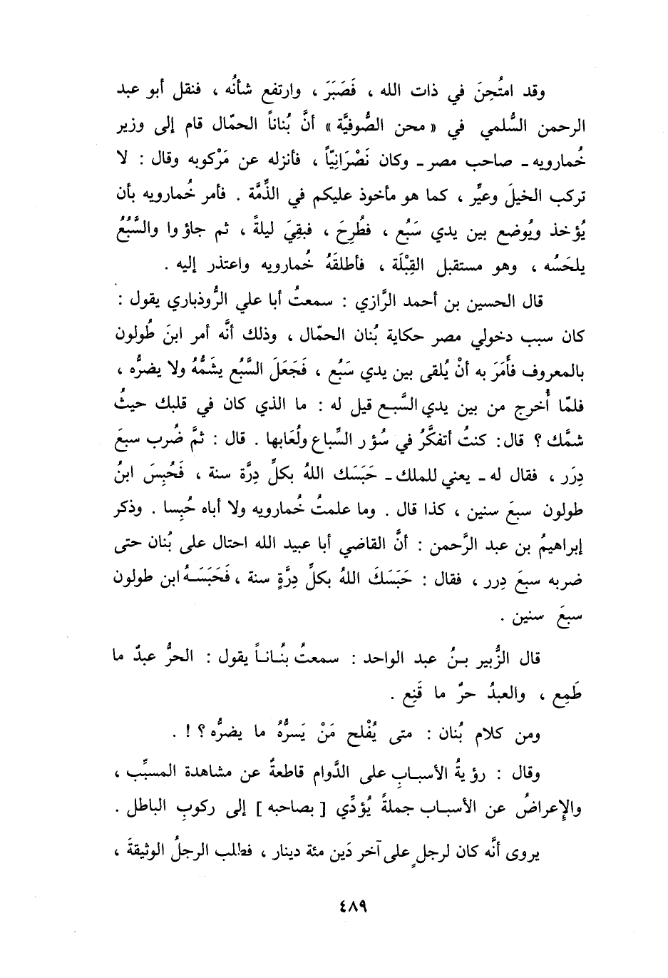 كَانَ سَبَبُ دُخُوْلِي مِصْرَ حِكَايَةَ بُنَانَ الحَمَّالَ، وَذَلِكَ أَنَّهُ أَمَرَ ابْنَ طُوْلُوْنَ بِالمَعْرُوْفِ، فَأَمَرَ بِهِ أَنْ يُلقَى بَيْنَ يَدَيْ سَبُعٍ، فَجَعَلَ السَّبُعُ يَشُمُّهُ وَلاَ يَضُرُّه، فَلَمَّا أُخرِجَ مِنْ بَيْنِ يَدَيِ السَّبُعِ، قِيْلَ لَهُ: مَا الَّذِي كَانَ فِي قَلْبِكَ حَيْثُ شَمَّكَ؟