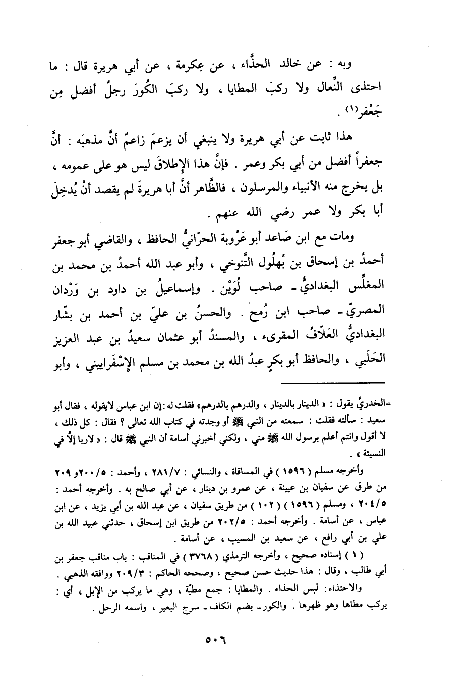 مَا احْتَذَى النِّعَالَ وَلاَ رَكِبَ المَطَايَا، وَلاَ رَكِبَ الكُورَ رَجُلٌ أَفْضَلُ مِنْ جَعْفَرٍ (1) .