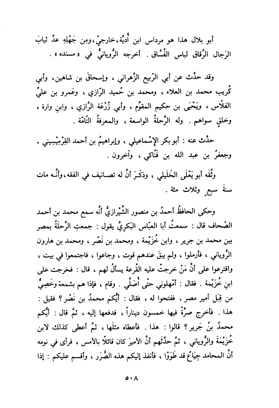 فَأَعطَاهُ مِثلَهَا، ثُمَّ أَعطَى كَذَلِكَ لاِبْنِ خُزَيْمَةَ وَالرُّويَانِيِّ، ثُمَّ حَدَّثهُم أَنَّ الأَمِيْرَ كَانَ قَائِلاً بِالأَمسِ، فَرَأَى فِي نَومِهِ أَنَّ المَحَامِدَ جِيَاعٌ قَدْ طَوَوْا، فَأَنفَذَ إِلَيْكُم هَذِهِ الصُّرَرَ، وَأَقسَمَ عَلَيْكُم: إِذَا