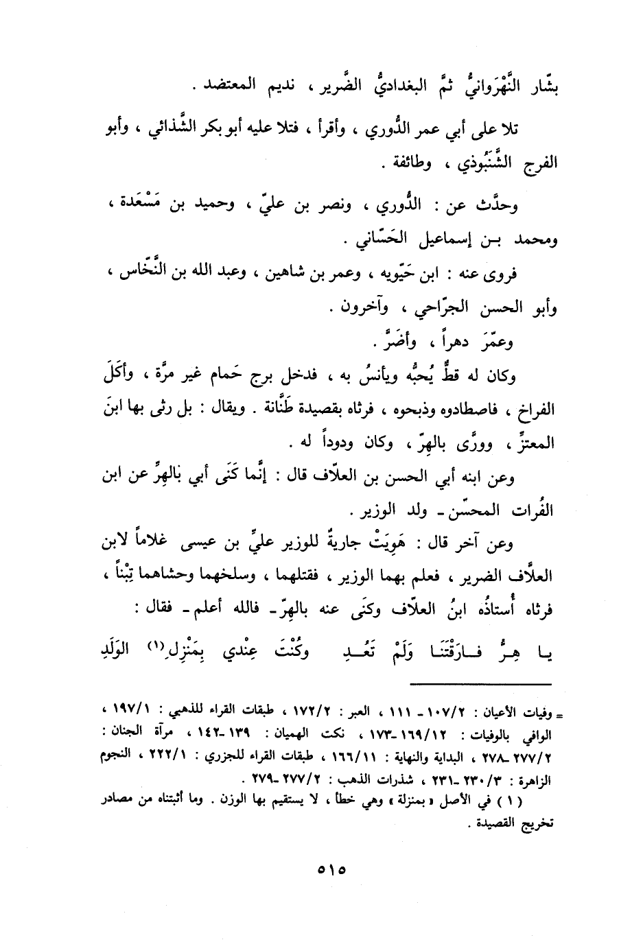 وَعَنْ آخَرَ، قَالَ: هَوِيَتْ جَارِيَةٌ لِلْوَزِيْرِ عَلِيِّ بنِ عِيْسَى غُلاَماً لاِبْنِ العَلاَّفِ الضَّرِيْرِ، فَعَلِمَ بِهِمَا الوَزِيْرُ، فَقَتَلَهُمَا، وَسَلَخَهُمَا وَحَشَاهُمَا تِبْناً، فَرَثَاهُ أُسْتَاذُهُ ابْنُ العَلاَّفِ، وَكَنَى عَنْهُ بِالهِرِّ - فَاللهُ أَعْلَمُ - فَقَالَ: